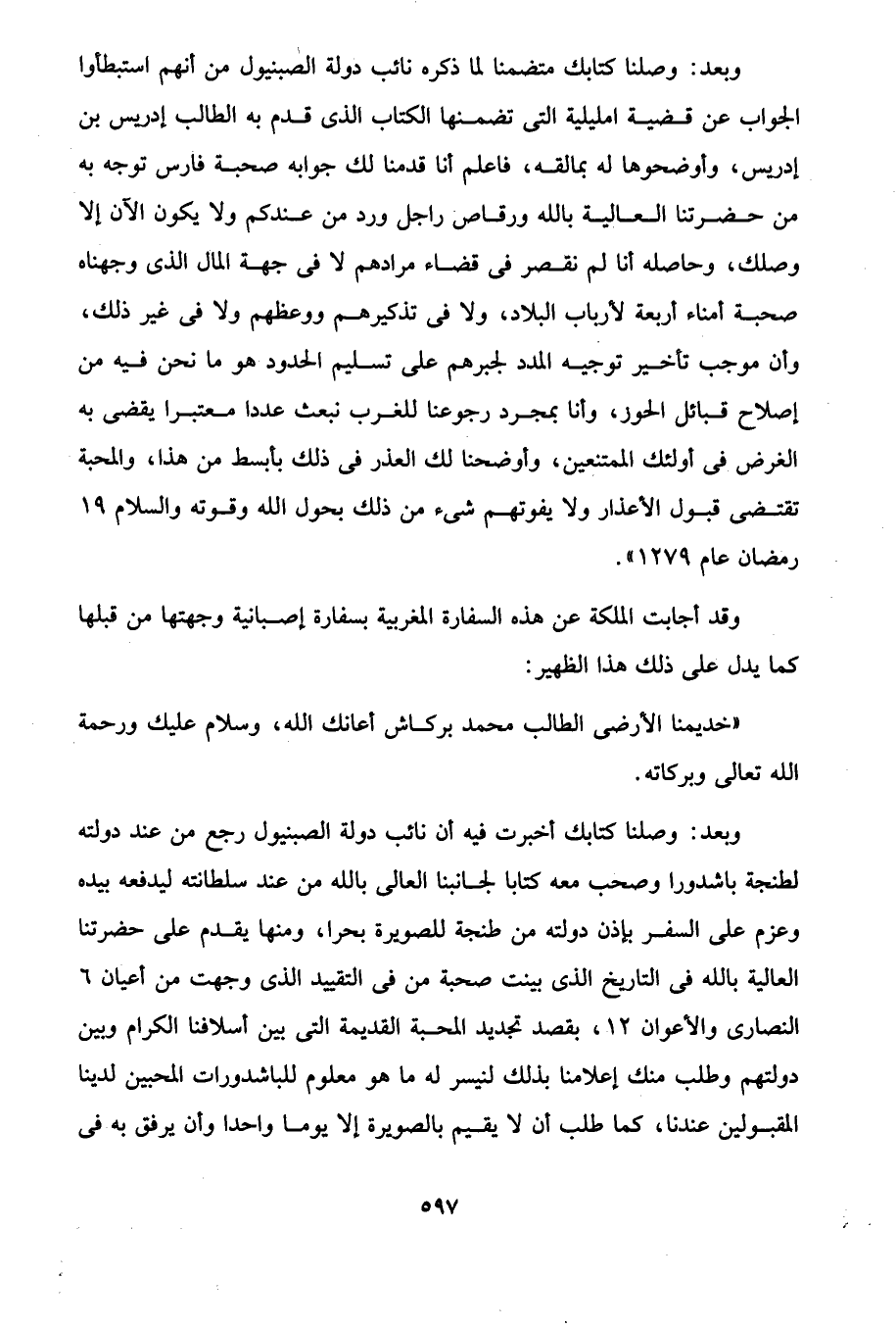 وبعد: وصلنا كتابك متضمنا لما ذكره نائب دولة الصبنيول من أنهم استبطأوا الجواب عن قضية امليلية التي تضمنها الكتاب الذى قدم به الطالب إدريس بن إدريس، وأوضحوها له بمالقه، فاعلم أنا قدمنا لك جوابه صحبة فارس توجه به من حضرتنا العالية بالله ورقاص راجل ورد من عندكم ولا يكون الآن إلا وصلك، وحاصله أنا لم نقصر في قضاء مرادهم لا في جهة المال الذى وجهناه صحبة أمناء أربعة لأرباب البلاد، ولا في تذكيرهم ووعظهم ولا في غير ذلك، وأن موجب تأخير توجيه المدد لجبرهم على تسليم الحدود هو ما نحن فيه من إصلاح قبائل الحوز، وأنا بمجرد رجوعنا للغرب نبعث عددا معتبرا يقضى به الغرض في أولئك الممتنعين، وأوضحنا لك العذر في ذلك بأبسط من هذا، والمحبة تقتضى قبول الأعذار ولا يفوتهم شئ من ذلك بحول الله وقوته والسلام 19 رمضان عام 1279".