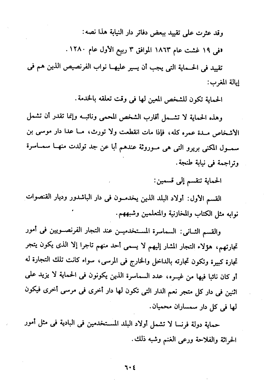 والقسم الثانى: السماسرة المستخدمين عند التجار الفرنصويين في أمور تجارتهم، هؤلاء التجار المشار إليهم لا يسمى أحد منهم تاجرا إلا الذى يكون يتجر تجارة كبيرة وتكون تجارته بالداخل والخارج في المرسى، سواء كانت تلك التجارة له أو كان نائبا فيها من غيره، عدد السماسرة الذين يكونون في الحماية لا يزيد على اثنين في دار كل متجر نعم الدار التي تكون لها دار أخرى في مرسى أخرى فيكون لها في كل دار سمساران محميان.