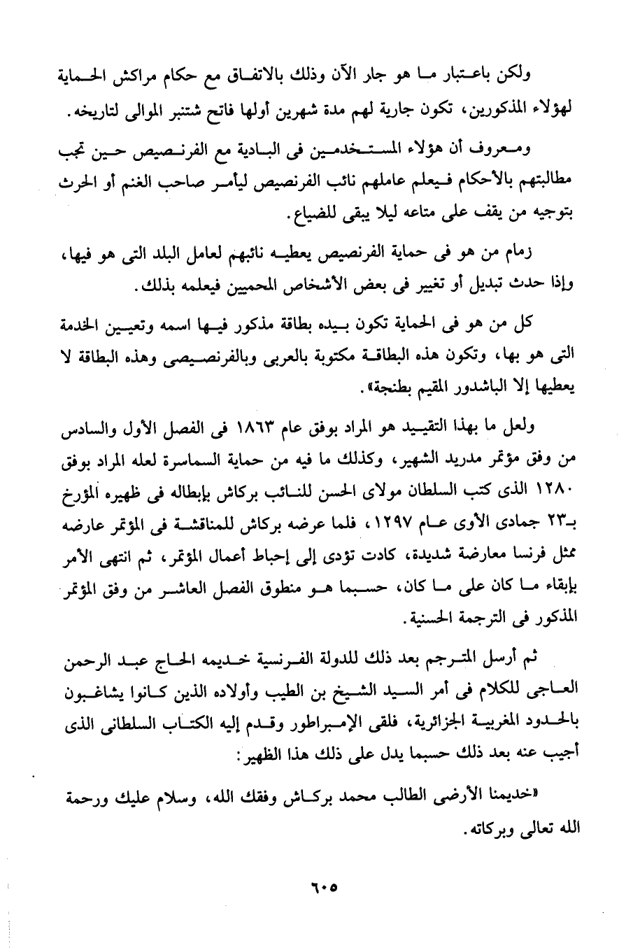 ولعل ما بهذا التقييد هو المراد بوفق عام 1863 في الفصل الأول والسادس من وفق مؤتمر مدريد الشهير، وكذلك ما فيه من حماية السماسرة لعله المراد بوفق 1280 الذى كتب السلطان مولاى الحسن للنائب بركاش بإبطاله في ظهيره المؤرخ بـ 23 جمادى الأولى عام 1297، فلما عرضه بركاش للمناقشة في المؤتمر عارضه ممثل فرنسا معارضة شديدة، كادت تؤدى إلى إحباط أعمال المؤتمر، ثم انتهى الأمر بإبقاء ما كان على ما كان، حسبما هو منطوق الفصل العاشر من وفق المؤتمر المذكور في الترجمة الحسنية.