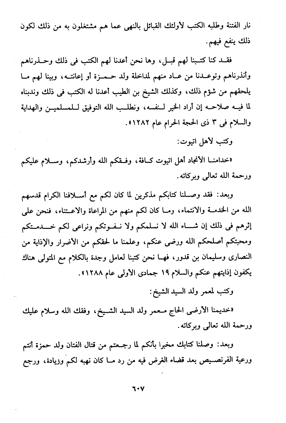 وبعد: فقد وصلنا كتابكم مذكرين لما كان لكم مع أسلافنا الكرام قدسهم الله من الخدمة والانتماء، وما كان لكم منهم من المراعاة والاعتناء، فنحن على إثرهم في ذلك إن شاء الله لا نسلمكم ولا نفوتكم ونراعى لكم خدمتكم ومحبتكم أصلحكم الله ورضى عنكم، وعلمنا ما لحقكم من الأضرار والإذاية من النصارى وسليمان بن قدور، فها نحن كتبنا لعامل وجدة بالكلام مع المتولى هناك يكفون إذايتهم عنكم والسلام 19 جمادى الأولى عام 1288".