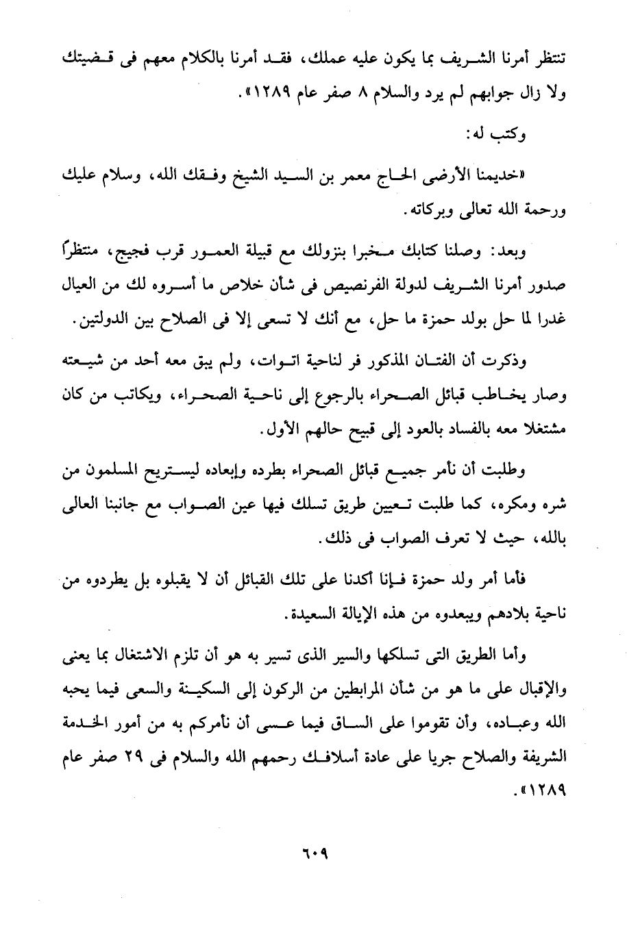 فأما أمر ولد حمزة فإنا أكدنا على تلك القبائل أن لا يقبلوه بل يطردوه من ناحية بلادهم ويبعدوه من هذه الإيالة السعيدة.