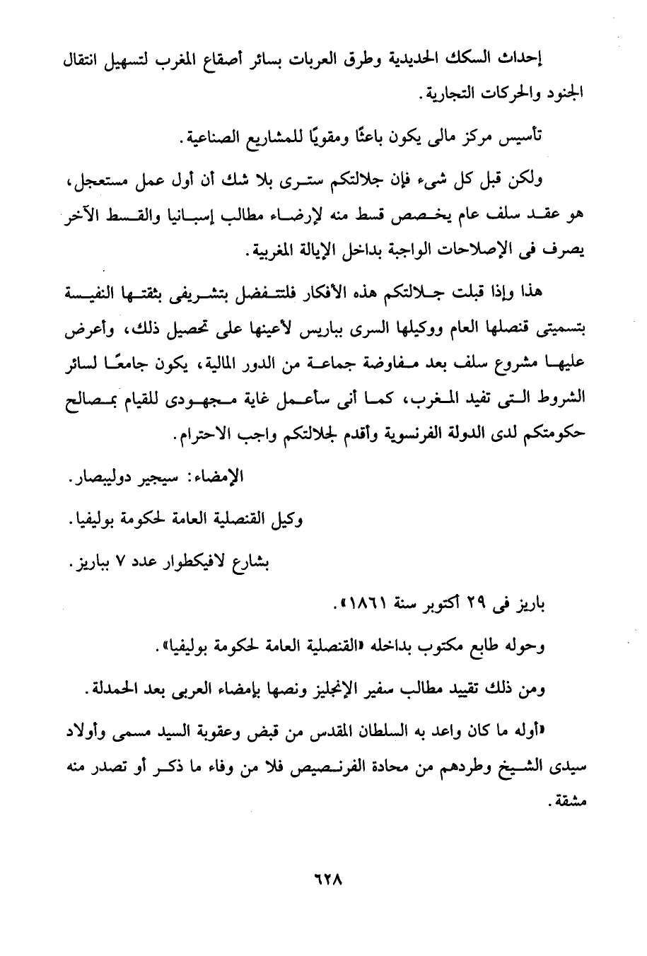هذا وإذا قبلت جلالتكم هذه الأفكار فلتتفضل بتشريفى بثقتها النفيسة بتسميتى قنصلها العام ووكيلها السرى بباريس لأعينها على تحصيل ذلك، وأعرض عليها مشروع سلف بعد مفاوضة جماعة من الدور المالية، يكون جامعًا لسائر الشروط التي تفيد المغرب، كما أنى سأعمل غاية مجهودى للقيام بمصالح حكومتكم لدى الدولة الفرنسوية وأقدم لجلالتكم واجب الاحترام.
