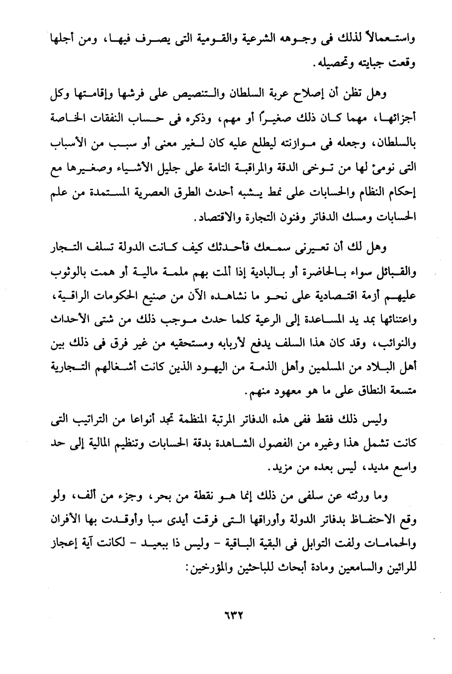وهل تظن أن إصلاح عربة السلطان والتنصيص على فرشها وإقامتها وكل أجزائها، مهما كان ذلك صغيرًا أو مهم، وذكره في حساب النفقات الخاصة بالسلطان، وجعله في موازنته ليطلع عليه كان لغير معنى أو سبب من الأسباب التي نومئ لها من توخى الدقة والمراقبة التامة على جليل الأشياء وصغيرها مع إحكام النظام والحسابات على نمط يشبه أحدث الطرق العصرية المستمدة من علم الحسابات ومسك الدفاتر وفنون التجارة والاقتصاد.