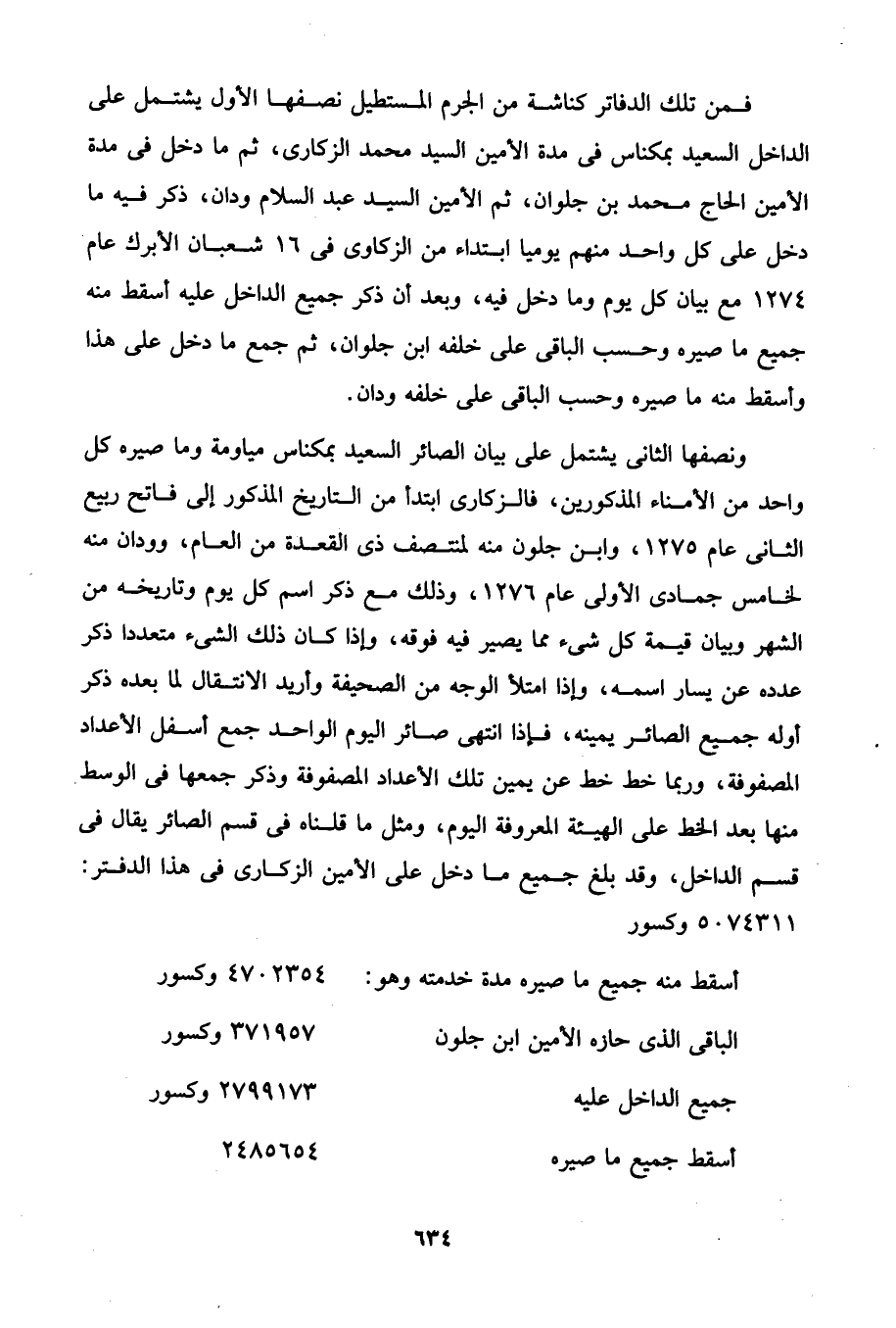 ونصفها الثانى يشتمل على بيان الصائر السعيد بمكناس مياومة وما صيره كل واحد من الأمناء المذكورين، فالزكارى ابتدأ من التاريخ المذكور إلى فاتح ربيع الثانى عام 1275، وابن جلون منه لمنتصف ذى القعدة من العام، وودان منه لخامس جمادى الأولى عام 1276، وذلك مع ذكر اسم كل يوم وتاريخه من الشهر وبيان قيمة كل شئ مما يصير فيه فوقه، وإذا كان ذلك الشئ متعددا ذكر عدده عن يسار اسمه، وإذا امتلأ الوجه من الصحيفة وأريد الانتقال لما بعده ذكر أوله جميع الصائر يمينه، فإذا انتهى صائر اليوم الواحد جمع أسفل الأعداد المصفوفة، وربما خط خط عن يمين تلك الأعداد المصفوفة وذكر جمعها في الوسط منها بعد الخط على الهيئة المعروفة اليوم، ومثل ما قلناه في قسم الصائر يقال في قسم الداخل، وقد بلغ جميع ما دخل على الأمين الزكارى في هذا الدفتر: 5074311 وكسور