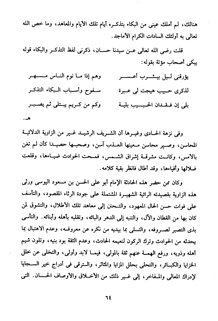 هنالك، لم أملك عينى من البكاء بتذكره أيام تلك الأيام والمعاهد، وما خص الله تعالى به أولئك السادات الكرام الأماجد.