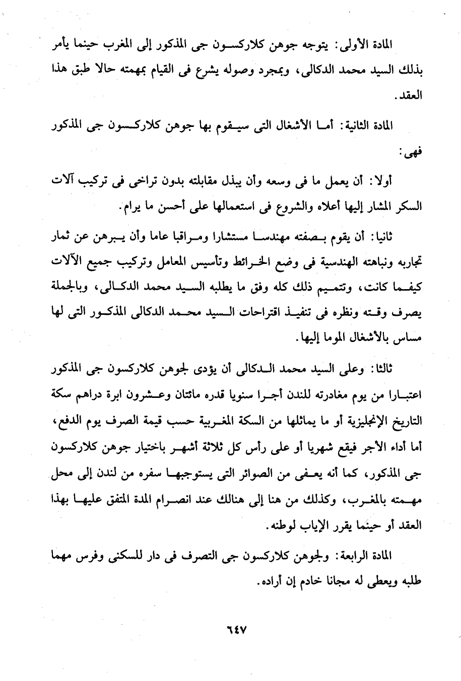 ثالثا: وعلى السيد محمد الدكالى أن يؤدى لجوهن كلاركسون جى المذكور اعتبارا من يوم مغادرته للندن أجرا سنويا قدره مائتان وعشرون ابرة دراهم سكة التاريخ الإنجليزية أو ما يماثلها من السكة المغربية حسب قيمة الصرف يوم الدفع، أما أداء الأجر فيقع شهريا أو على رأس كل ثلاثة أشهر باختيار جوهن كلاركسون جى المذكور، كما أنه يعفى من الصوائر التي يستوجبها سفره من لندن إلى محل مهمته بالمغرب، وكذلك من هنا إلى هنالك عند انصرام المدة المتفق عليها بهذا العقد أو حينما يقرر الإياب لوطنه.