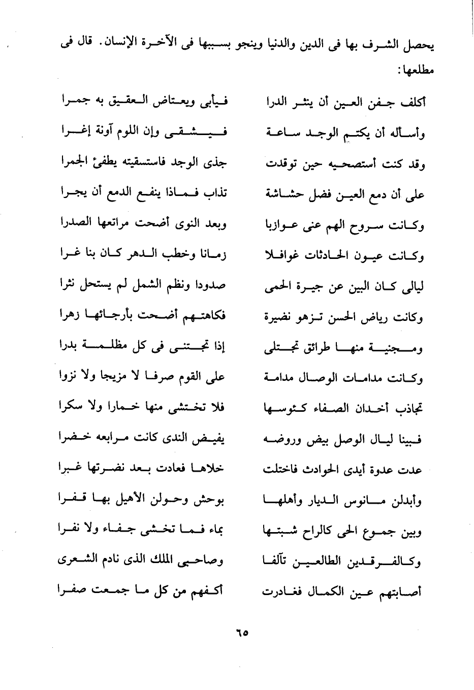 يحصل الشرف بها في الدين والدنيا وينجو بسببها في الآخرة الإنسان. قال في مطلعها: