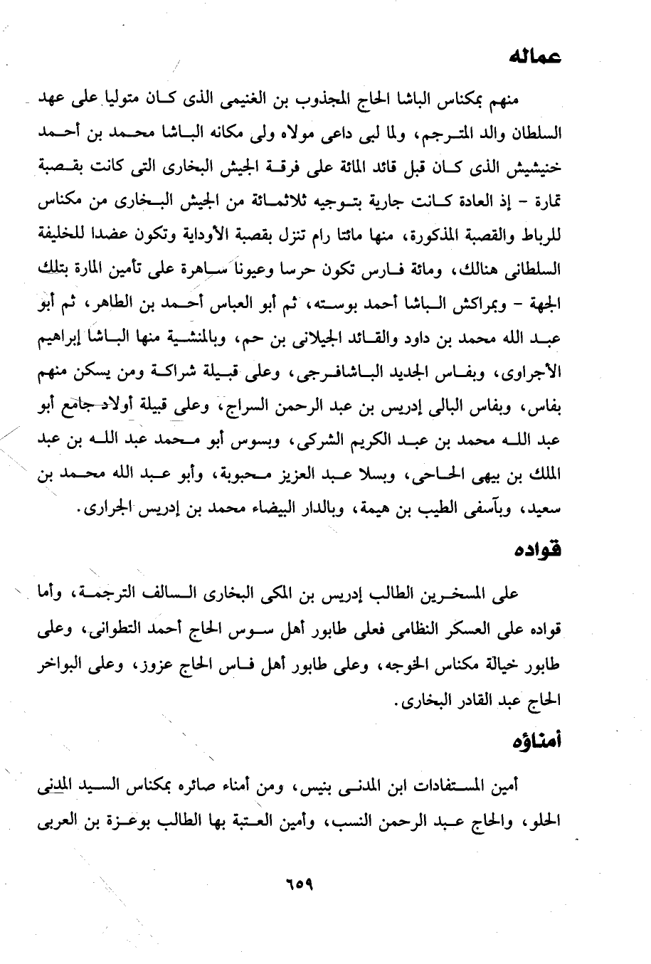 على المسخرين الطالب إدريس بن المكى البخارى السالف الترجمة، وأما قواده على العسكر النظامى فعلى طابور أهل سوس الحاج أحمد التطوانى، وعلى طابور خيالة مكناس الخوجه، وعلى طابور أهل فاس الحاج عزوز، وعلى البواخر الحاج عبد القادر البخارى.