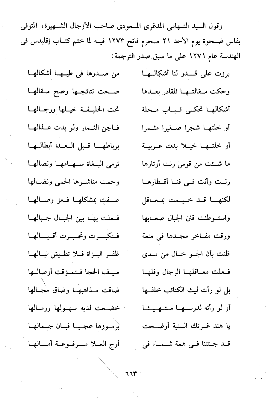 وقول السيد التهامى المدغرى المسعودى صاحب الأزجال الشهيرة، المتوفى بفاس ضحوة يوم الأحد 21 محرم فاتح 1273 فيه لما ختم كتاب إقليدس في الهندسة عام 1271 على ما سبق صدر الترجمة: