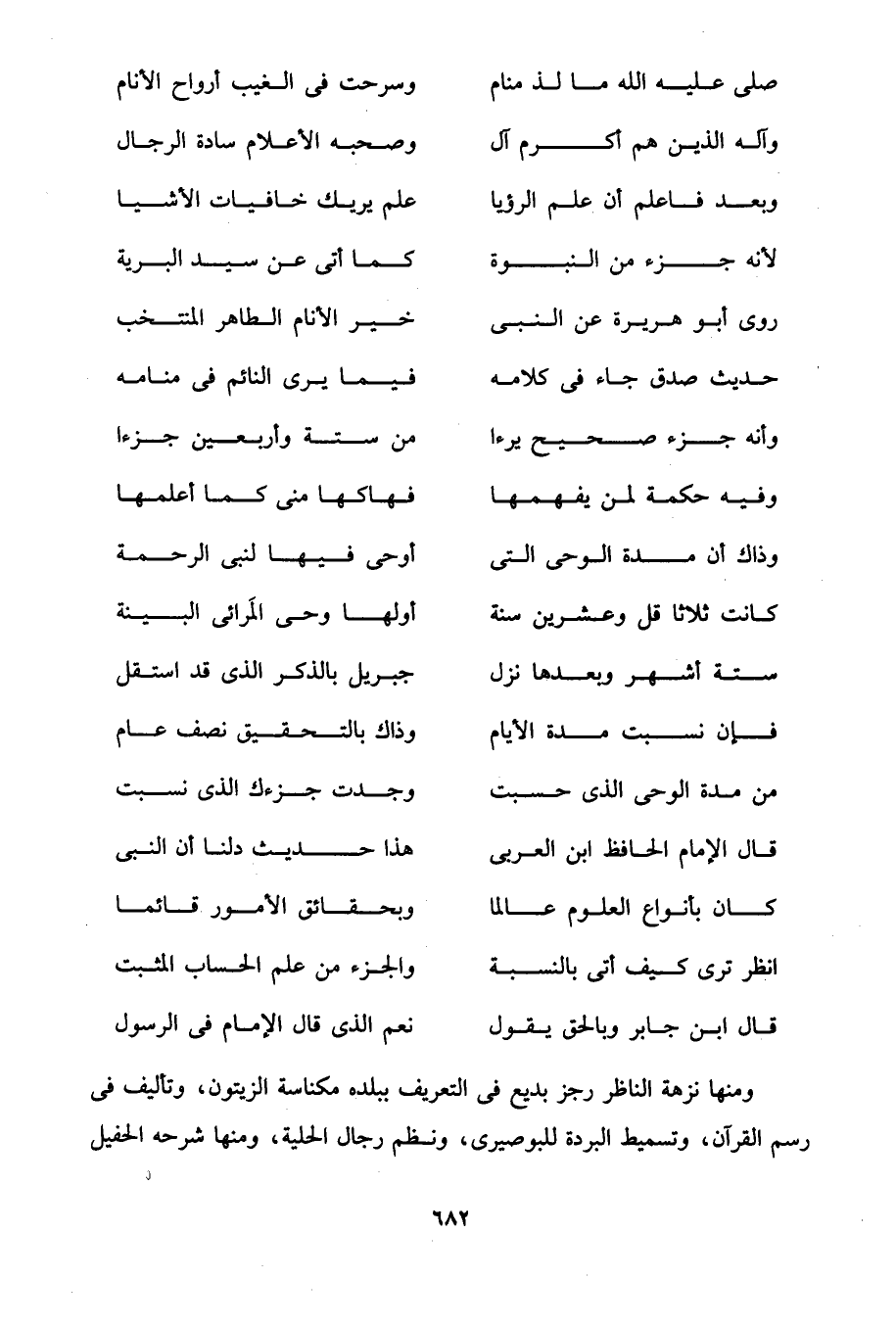 ومنها نزهة الناظر رجز بديع في التعريف ببلده مكناسة الزيتون، وتأليف في رسم القرآن، وتسميط البردة للبوصيرى، ونظم رجال الحلية، ومنها شرحه الحفيل