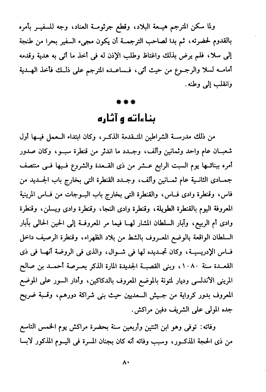 من ذلك مدرسة الشراطين المتقدمة الذكر، وكان ابتداء العمل فيها أول شعبان عام واحد وثمانين وألف، وجدد ما اندثر من قنطرة سبو، وكان صدور أمره ببنائها يوم السبت الرابع عشر من ذى القعدة والشروع فيها في منتصف جمادى الثانية عام ثمانين وألف، وجدد القنطرة التي بخارج باب الجديد من فاس، وقنطرة وادى فاس، والقنطرة التي بخارج باب البوجات من فاس المرينية المعروفة اليوم بالقنطرة الطويلة، وقنطرة وادى النجا، وقنطرة وادى ويسلن، وقنطرة وادى أم الربيع، وآبار السلطان المشار لها فيما مر المعروفة إلى الحين الحالى بآبار السلطان الواقعة بالوضع المعروف بالشط من بلاد الظهراء، وقنطرة الرصيف داخل فاس الإدريسية، وكان تجديده لها في شوال، والذي في الروضة أنها في ذى القعدة سنة 1080، وبنى القصبة الجديدة المارة الذكر بعرصة أحمد بن صالح المرينى الأندلسى وديار لمتونة بالموضع المعروف بالدكاكين، وأدار السور على الموضع المعروف بدور كرواية من جيش السعديين حيث بنى شراكة دورهم، وقبة ضريح جده المولى على الشريف دفين مراكش.