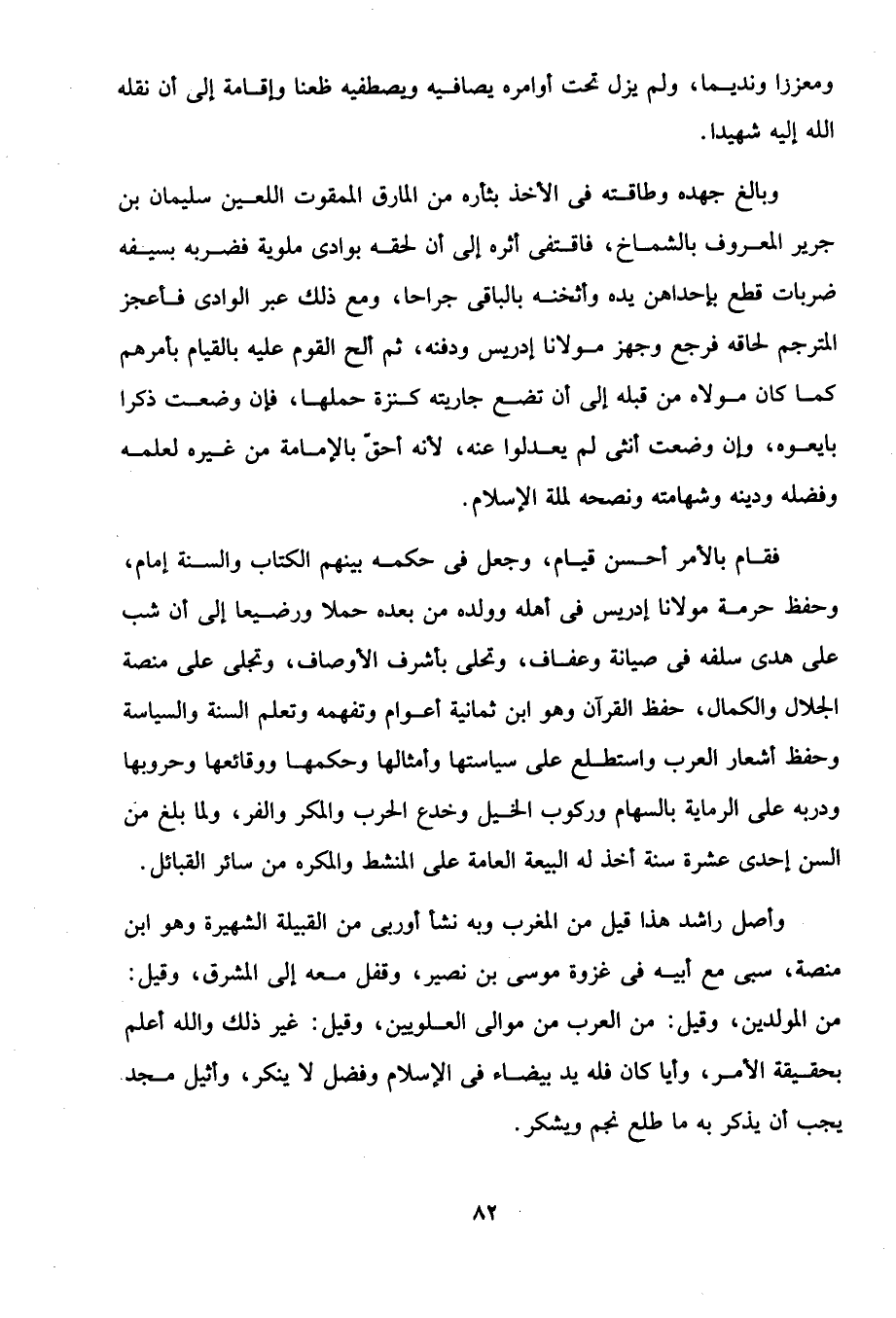 فقام بالأمر أحسن قيام، وجعل في حكمه بينهم الكتاب والسنة إمام، وحفظ حرمة مولانا إدريس في أهله وولده من بعده حملا ورضيعا إلى أن شب على هدى سلفه في صيانة وعفاف، وتحلى بأشرف الأوصاف، وتجلى على منصة الجلال والكمال، حفظ القرآن وهو ابن ثمانية أعوام وتفهمه وتعلم السنة والسياسة وحفظ أشعار العرب واستطلع على سياستها وأمثالها وحكمها ووقائعها وحروبها ودربه على الرماية بالسهام وركوب الخيل وخدع الحرب والمكر والفر، ولما بلغ من السن إحدى عشرة سنة أخذ له البيعة العامة على المنشط والمكره من سائر القبائل.