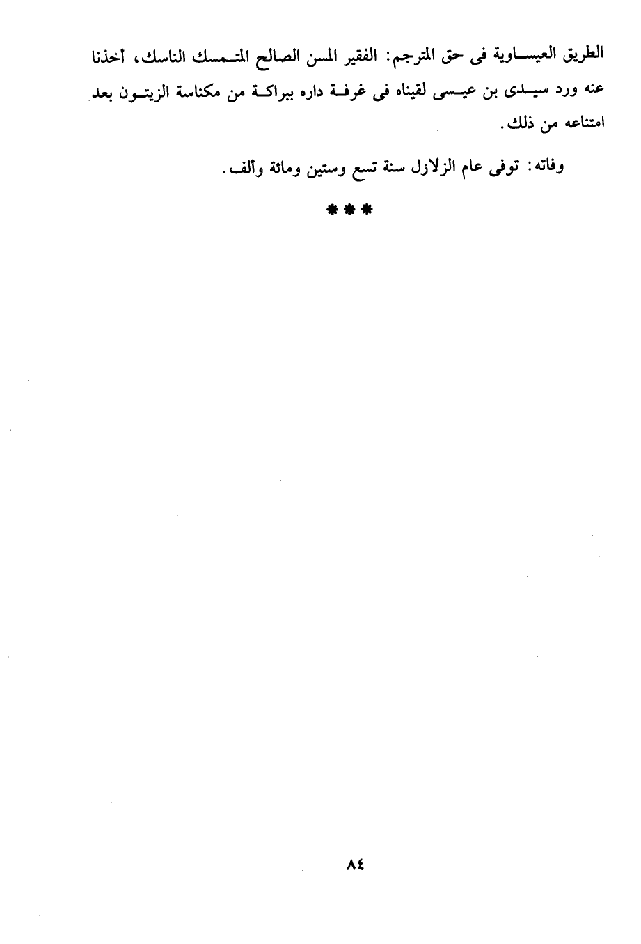 الطريق العيساوية في حق المترجم: الفقير المسن الصالح المتمسك الناسك، أخذنا عنه ورد سيدى بن عيسى لقيناه في غرفة داره ببراكة من مكناسة الزيتون بعد امتناعه من ذلك.