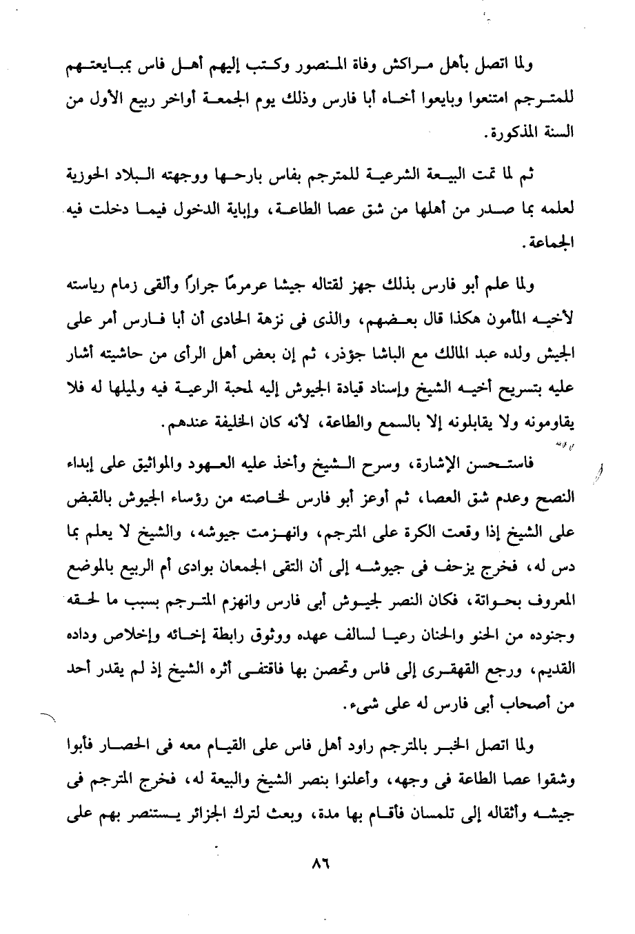 فاستحسن الإشارة، وسرح الشيخ وأخذ عليه العهود والمواثيق على إبداء النصح وعدم شق العصا، ثم أوعز أبو فارس لخاصته من رؤساء الجيوش بالقبض على الشيخ إذا وقعت الكرة على المترجم، وانهزمت جيوشه، والشيخ لا يعلم بما دس له، فخرج يزحف في جيوشه إلى أن التقى الجمعان بوادى أم الربيع بالموضع المعروف بحواتة، فكان النصر لجيوش أبي فارس وانهزم المترجم بسبب ما لحقه وجنوده من الحنو والحنان رعيا لسالف عهده ووثوق رابطة إخائه وإخلاص وداده القديم، ورجع القهقرى إلى فاس وتحصن بها فاقتفى أثره الشيخ إذ لم يقدر أحد من أصحاب أبي فارس له على شيء.