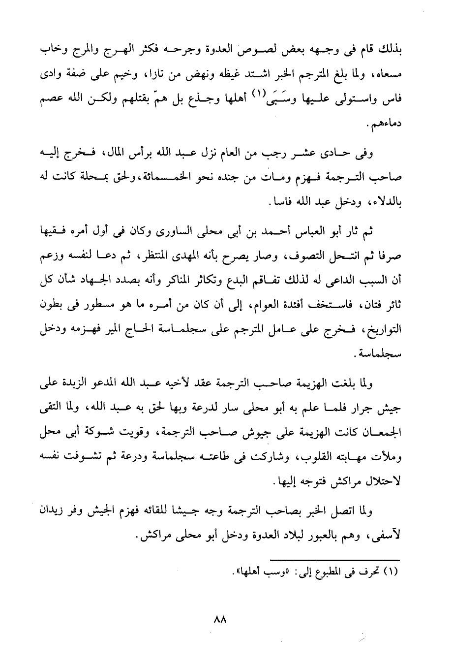 وفى حادى عشر رجب من العام نزل عبد الله برأس المال، فخرج إليه صاحب الترجمة فهزم ومات من جنده نحو الخمسمائة، ولحق بمحلة كانت له بالدلاء، ودخل عبد الله فاسا.