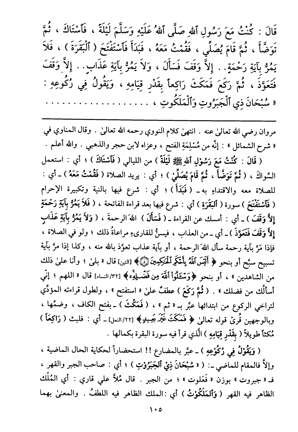 قال: كنت مع رسول الله صلّى الله عليه وسلّم ليلة، فاستاك، ثمّ توضّأ، ثمّ قام يصلّي، فقمت معه، فبدأ فاستفتح (البقرة) ، فلا يمرّ باية رحمة.. إلّا وقف فسأل، ولا يمرّ باية عذاب.. إلّا وقف فتعوّذ، ثمّ ركع فمكث راكعا بقدر قيامه، ويقول في ركوعه: