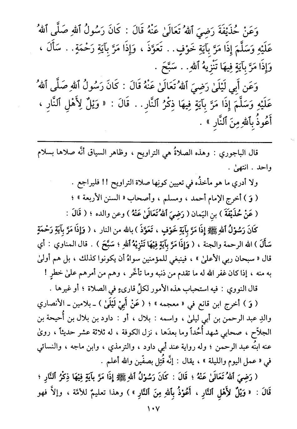 وعن أبي ليلى رضي الله تعالى عنه قال: كان رسول الله صلّى الله عليه وسلّم إذا مرّ باية فيها ذكر النّار.. قال: «ويل لأهل النّار، أعوذ بالله من النّار» .