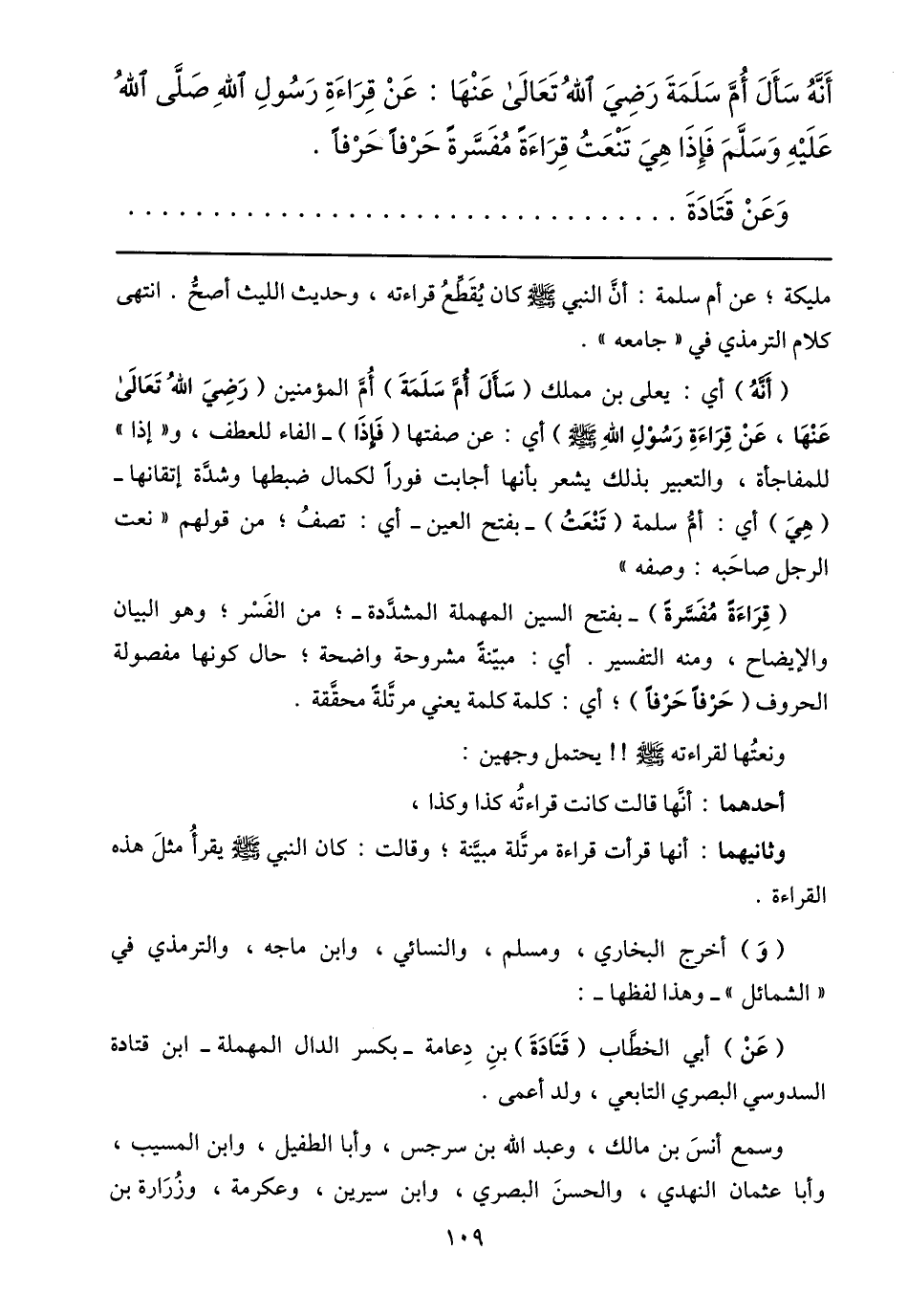 أنّه سأل أمّ سلمة رضي الله تعالى عنها: عن قراءة رسول الله صلّى الله عليه وسلّم فإذا هي تنعت قراءة مفسّرة حرفا حرفا.