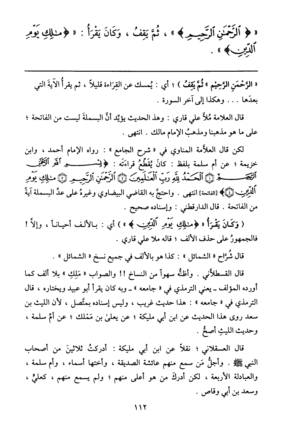 لكن قال العلّامة المناوي في «شرح الجامع» : رواه الإمام أحمد، وابن خزيمة؛ عن أم سلمة بلفظ: كان يقطّع قراءته: بِسْمِ اللَّهِ الرَّحْمنِ الرَّحِيمِ (1) الْحَمْدُ لِلَّهِ رَبِّ الْعالَمِينَ (2) الرَّحْمنِ الرَّحِيمِ (3) مالِكِ يَوْمِ الدِّينِ (4) [الفاتحة] انتهى. واحتجّ به القاضي البيضاوي وغيره على عدّ البسملة آية من الفاتحة. قال الدارقطني: وإسناده صحيح.