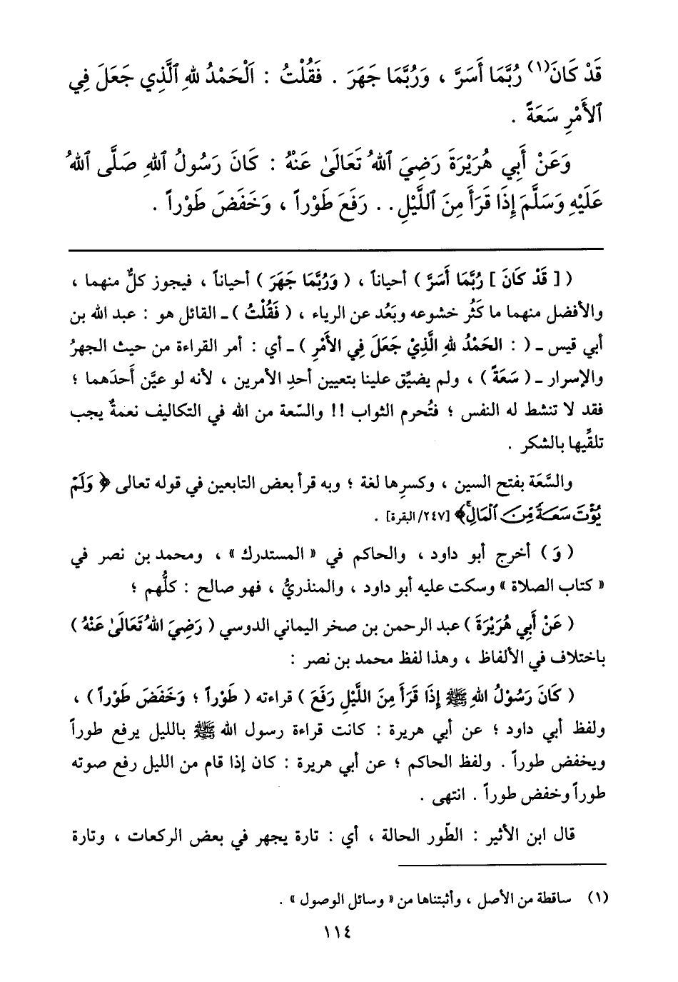 وعن أبي هريرة رضي الله تعالى عنه: كان رسول الله صلّى الله عليه وسلّم إذا قرأ من اللّيل.. رفع طورا، وخفض طورا.