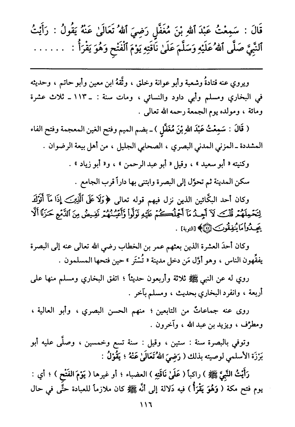 قال: سمعت عبد الله بن مغفّل رضي الله تعالى عنه يقول: رأيت النّبيّ صلّى الله عليه وسلّم على ناقته يوم الفتح وهو يقرأ: ...