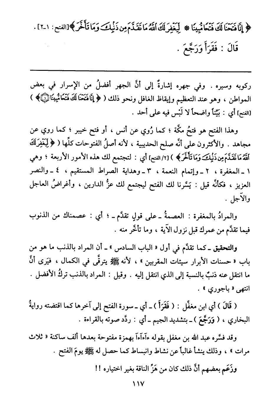 وهذا الفتح هو فتح مكّة؛ كما روي عن أنس، أو فتح خيبر؛ كما روي عن مجاهد. والأكثرون على أنّه صلح الحديبية، لأنه أصل الفتوحات كلّها لِيَغْفِرَ لَكَ اللَّهُ ما تَقَدَّمَ مِنْ ذَنْبِكَ وَما تَأَخَّرَ) [2/ الفتح] أي: لتجتمع لك هذه الأمور الأربعة؛ وهي 1- المغفرة، 2- وإتمام النعمة، 3- وهداية الصراط المستقيم، 4- والنصر العزيز، فكأنّه قيل: يسّرنا لك الفتح ليجتمع لك عزّ الدارين، وأغراض العاجل والآجل.