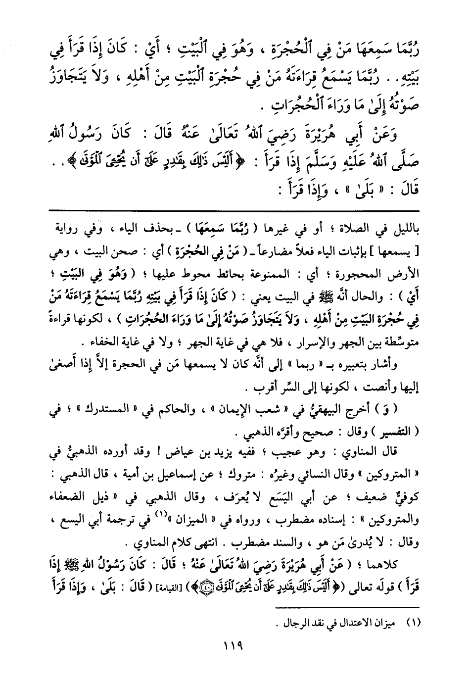 كلاهما؛ (عن أبي هريرة رضي الله تعالى عنه؛ قال: كان رسول الله صلى الله عليه وسلّم إذا قرأ) قوله تعالى (أَلَيْسَ ذلِكَ بِقادِرٍ عَلى أَنْ يُحْيِيَ الْمَوْتى (40)) [القيامة] (قال: بلى، وإذا قرأ