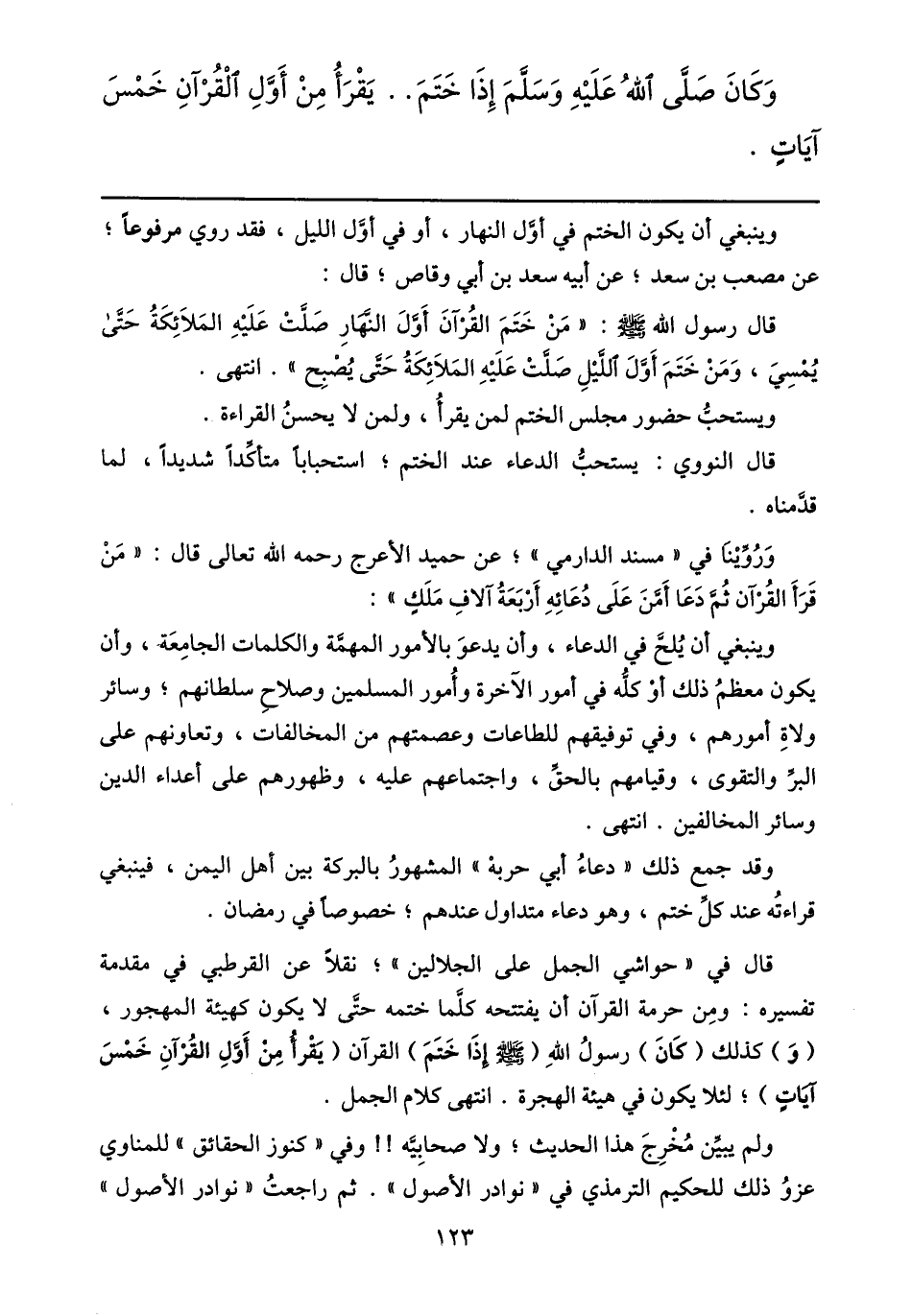وكان صلّى الله عليه وسلّم إذا ختم.. يقرأ من أوّل القرآن خمس آيات.