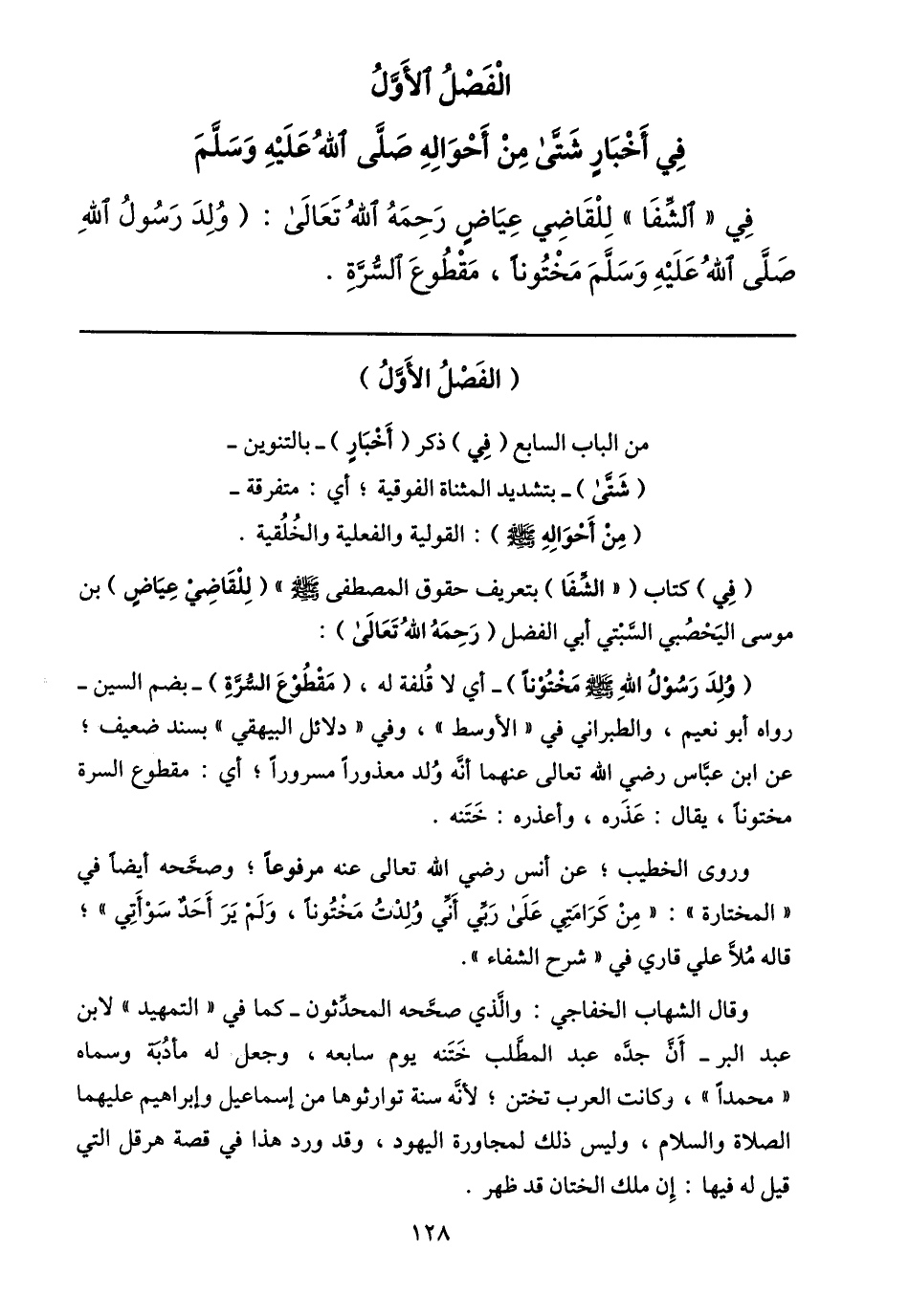 الفصل الأوّل في أخبار شتّى من أحواله صلّى الله عليه وسلّم في «الشّفا» للقاضي عياض رحمه الله تعالى: (ولد رسول الله صلّى الله عليه وسلّم مختونا، مقطوع السّرّة.