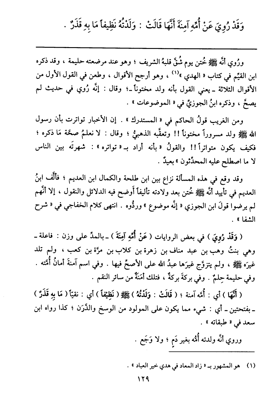 وقد وقع في هذه المسألة نزاع بين ابن طلحة والكمال ابن العديم؛ فألّف ابن العديم في تأييد أنّه صلى الله عليه وسلم ختن بعد ولادته تأليفا أوضح فيه الدلائل والنقول، إلا أنّهم لم يرضوا قول ابن الجوزي «إنّه موضوع» وردّوه. انتهى كلام الخفاجي في «شرح الشفا» .