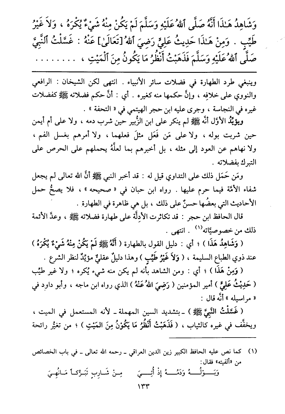 وينبغي طرد الطهارة في فضلات سائر الأنبياء. انتهى لكن الشيخان: الرافعي والنووي على خلافه، وإنّ حكمها منه كغيره. أي: أنّ حكم فضلاته صلى الله عليه وسلّم كفضلات غيره في النجاسة، وجرى عليه ابن حجر الهيتمي في «التحفة» .
