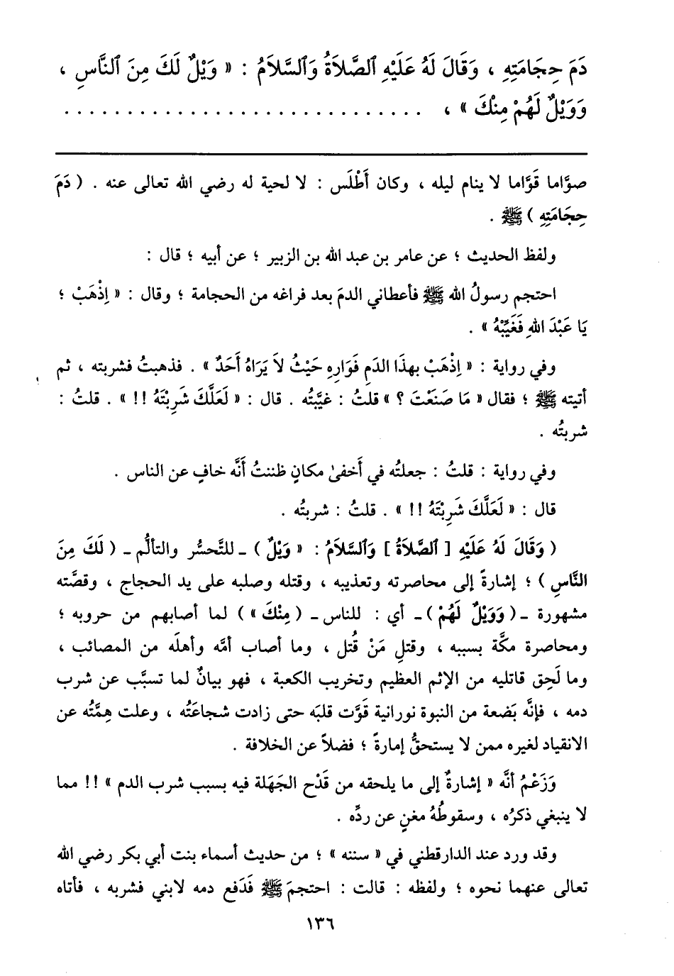 صوّاما قوّاما لا ينام ليله، وكان أطلس: لا لحية له رضي الله تعالى عنه. (دم حجامته) صلى الله عليه وسلّم.
