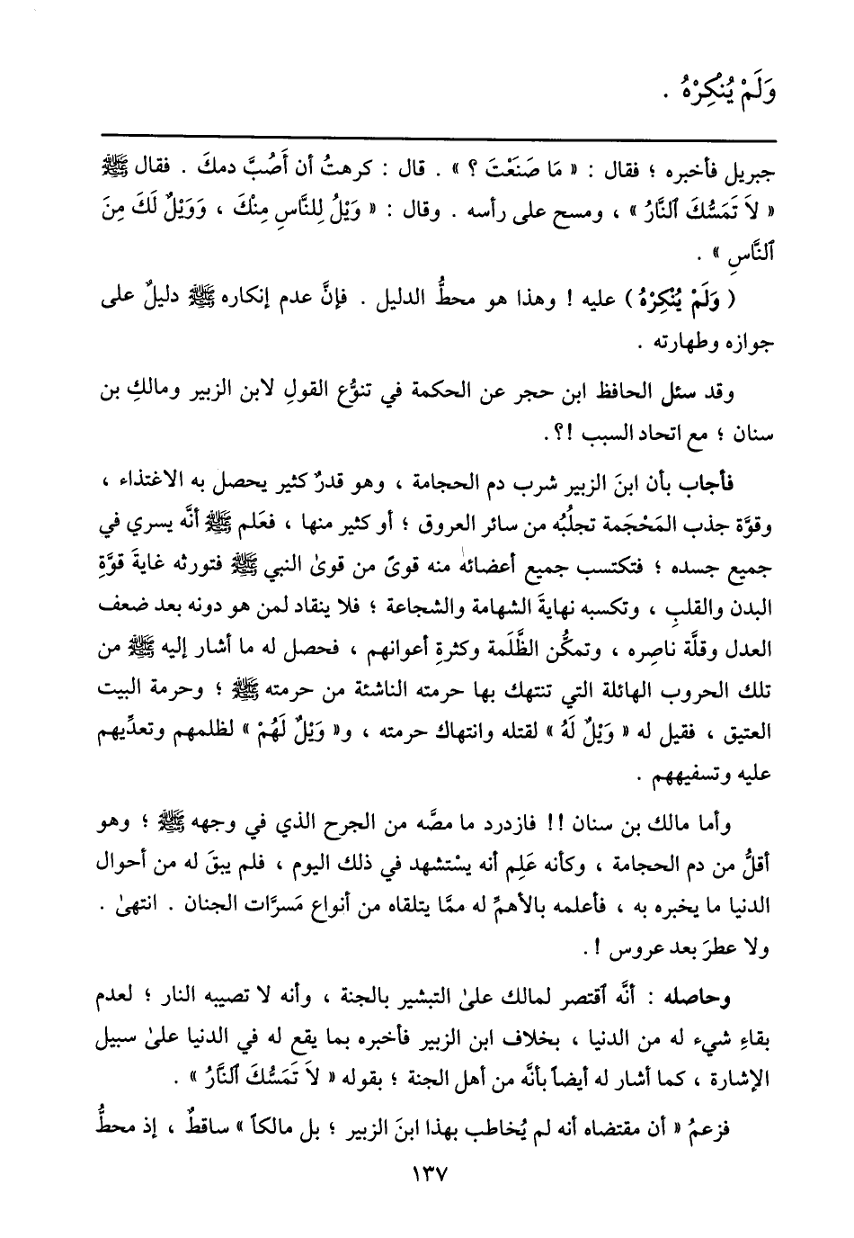 فأجاب بأن ابن الزبير شرب دم الحجامة، وهو قدر كثير يحصل به الاغتذاء، وقوّة جذب المحجمة تجلبه من سائر العروق؛ أو كثير منها، فعلم صلى الله عليه وسلّم أنّه يسري في جميع جسده؛ فتكتسب جميع أعضائه منه قوى من قوى النبي صلى الله عليه وسلّم فتورثه غاية قوّة البدن والقلب، وتكسبه نهاية الشهامة والشجاعة؛ فلا ينقاد لمن هو دونه بعد ضعف العدل وقلّة ناصره، وتمكّن الظّلمة وكثرة أعوانهم، فحصل له ما أشار إليه صلى الله عليه وسلّم من تلك الحروب الهائلة التي تنتهك بها حرمته الناشئة من حرمته صلى الله عليه وسلّم؛ وحرمة البيت العتيق، فقيل له «ويل له» لقتله وانتهاك حرمته، و «ويل لهم» لظلمهم وتعدّيهم عليه وتسفيههم.