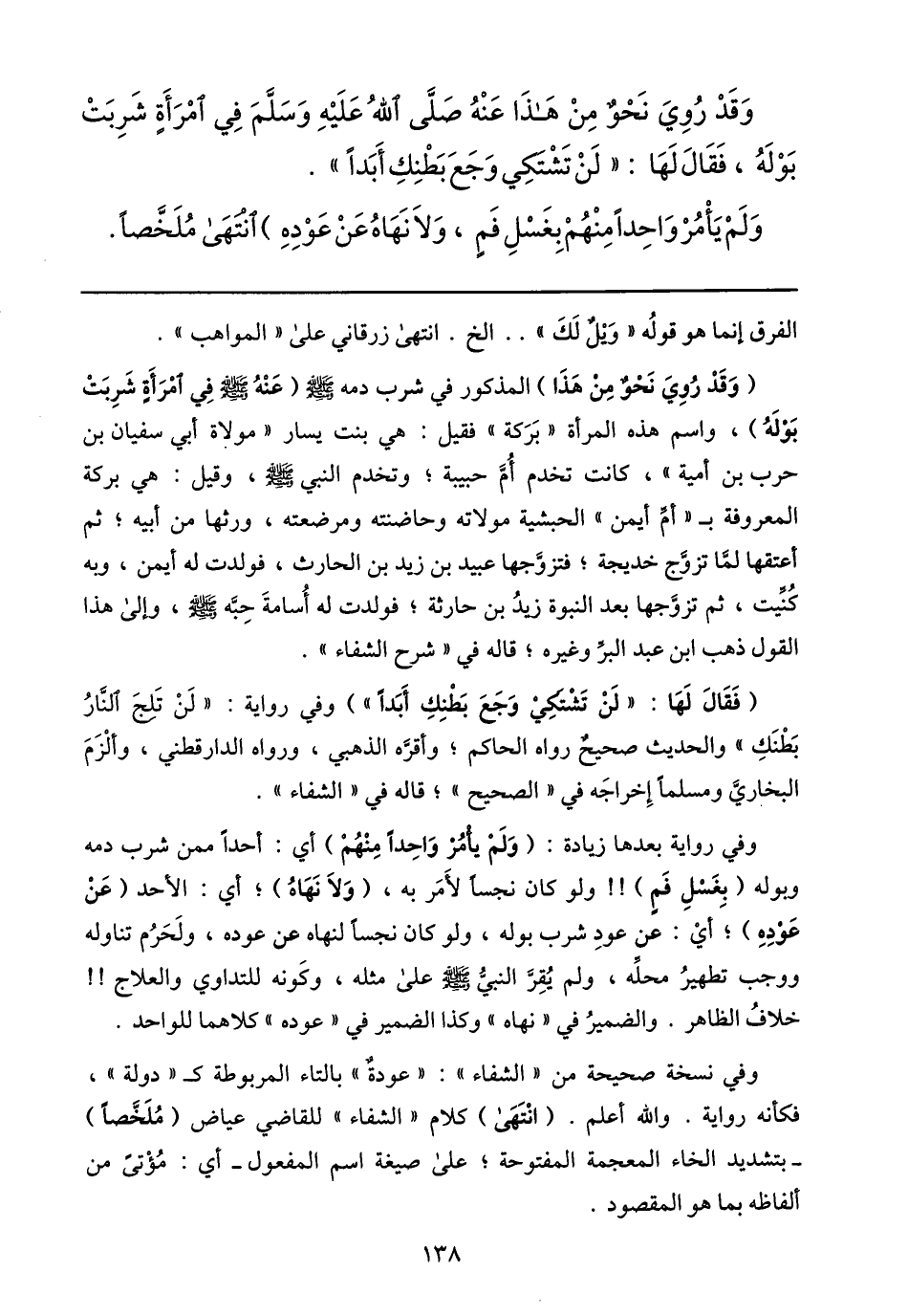 (وقد روي نحو من هذا) المذكور في شرب دمه صلى الله عليه وسلّم (عنه صلى الله عليه وسلّم في امرأة شربت بوله) ، واسم هذه المرأة «بركة» فقيل: هي بنت يسار «مولاة أبي سفيان بن حرب بن أمية» ، كانت تخدم أمّ حبيبة؛ وتخدم النبي صلى الله عليه وسلّم، وقيل: هي بركة المعروفة ب «أمّ أيمن» الحبشية مولاته وحاضنته ومرضعته، ورثها من أبيه؛ ثم أعتقها لمّا تزوّج خديجة؛ فتزوّجها عبيد بن زيد بن الحارث، فولدت له أيمن، وبه كنّيت، ثم تزوّجها بعد النبوة زيد بن حارثة؛ فولدت له أسامة حبّه صلى الله عليه وسلّم، وإلى هذا القول ذهب ابن عبد البرّ وغيره؛ قاله في «شرح الشفاء» .