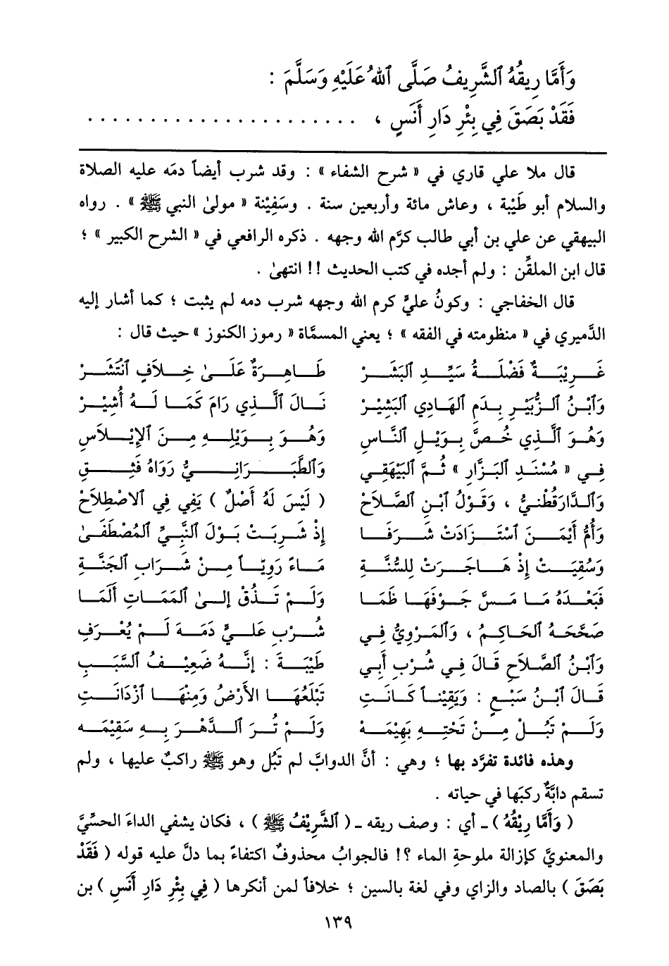 (وأمّا ريقه) - أي: وصف ريقه- (الشّريف صلى الله عليه وسلّم) ، فكان يشفي الداء الحسّيّ والمعنويّ كإزالة ملوحة الماء؟! فالجواب محذوف اكتفاء بما دلّ عليه قوله (فقد بصق) بالصاد والزاي وفي لغة بالسين؛ خلافا لمن أنكرها (في بئر دار أنس) بن
