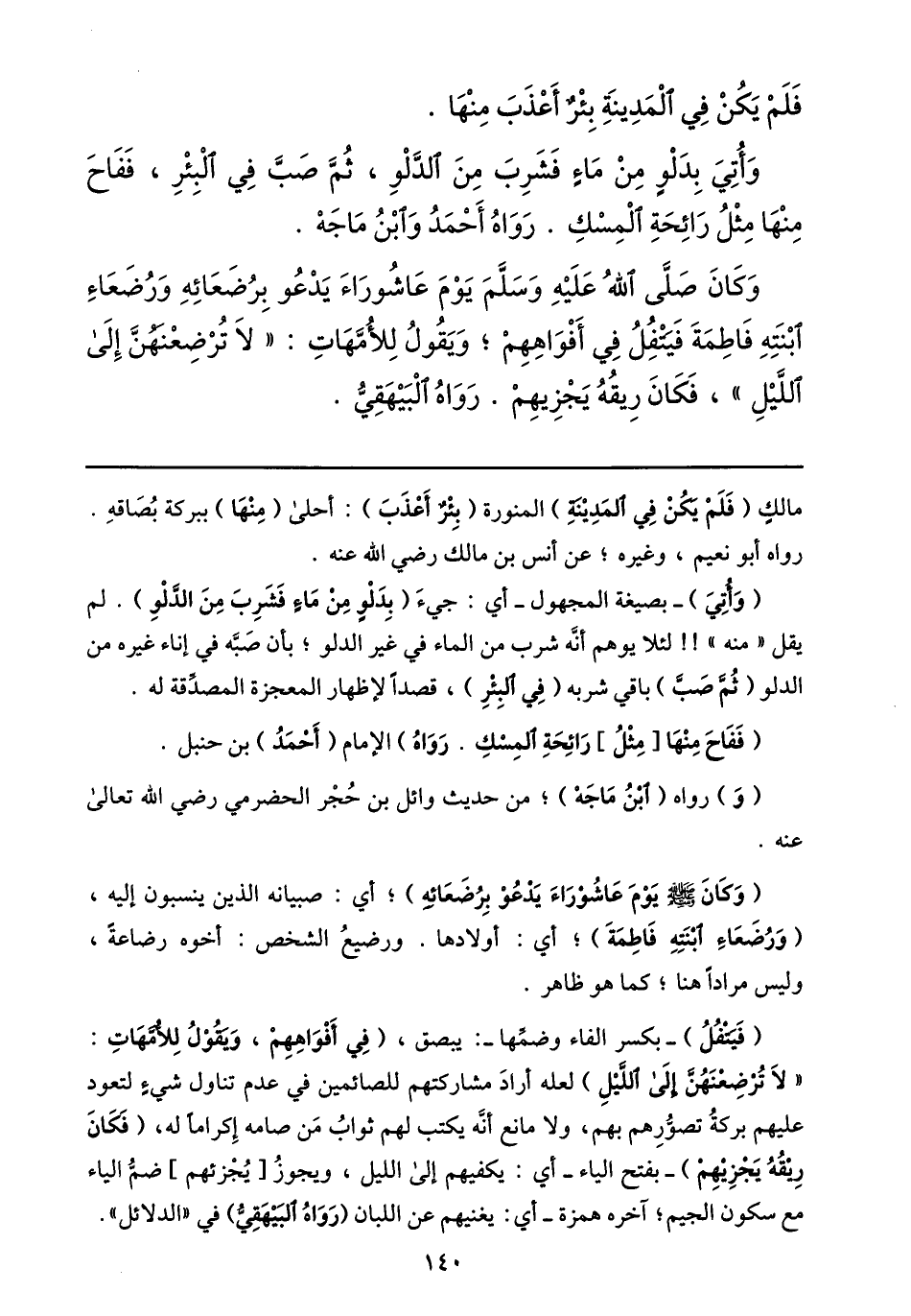 «لا ترضعنهنّ إلى اللّيل) لعله أراد مشاركتهم للصائمين في عدم تناول شيء لتعود عليهم بركة تصوّرهم بهم، ولا مانع أنّه يكتب لهم ثواب من صامه إكراما له، (فكان ريقه يجزيهم) - بفتح الياء- أي: يكفيهم إلى الليل، ويجوز [يجزئهم] ضمّ الياء مع سكون الجيم؛ آخره همزة- أي: يغنيهم عن اللبان (رواه البيهقيّ) في «الدلائل» .