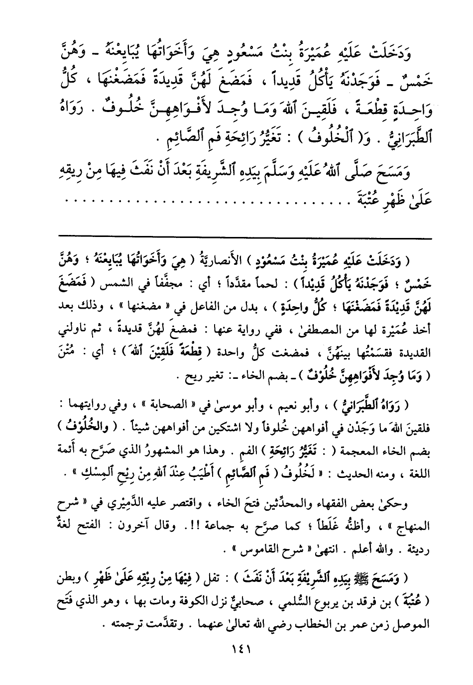 فلقين الله ما وجدن في أفواههن خلوفا ولا اشتكين من أفواههن شيئا. (والخلوف) بضم الخاء المعجمة (: تغيّر رائحة) الفم. وهذا هو المشهور الذي صرّح به أئمة اللغة، ومنه الحديث: «لخلوف (فم الصّائم) أطيب عند الله من ريح المسك» .