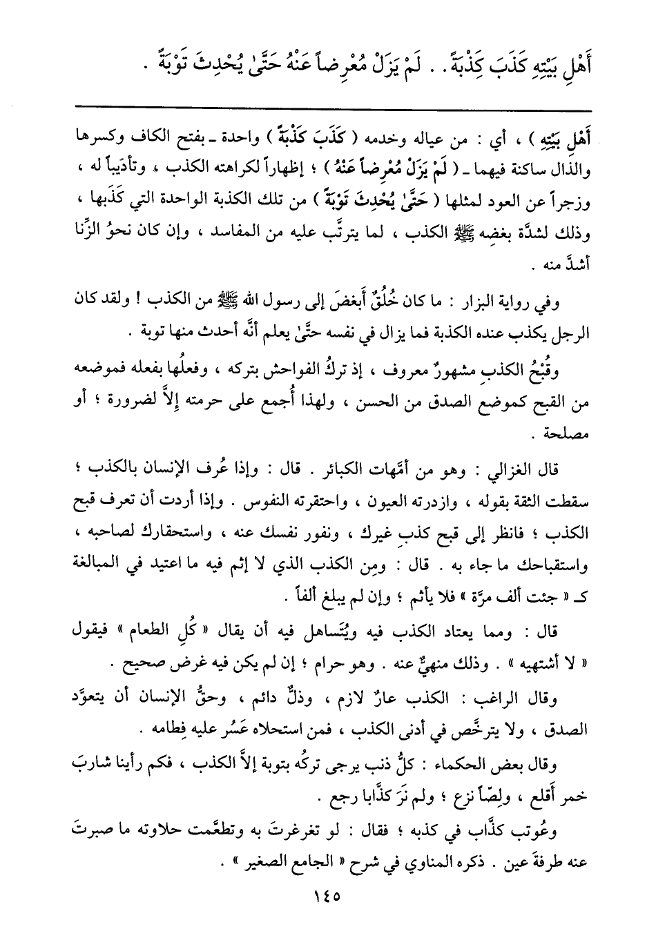 قال الغزالي: وهو من أمّهات الكبائر. قال: وإذا عرف الإنسان بالكذب؛ سقطت الثقة بقوله، وازدرته العيون، واحتقرته النفوس. وإذا أردت أن تعرف قبح الكذب؛ فانظر إلى قبح كذب غيرك، ونفور نفسك عنه، واستحقارك لصاحبه، واستقباحك ما جاء به. قال: ومن الكذب الذي لا إثم فيه ما اعتيد في المبالغة ك «جئت ألف مرّة» فلا يأثم؛ وإن لم يبلغ ألفا.