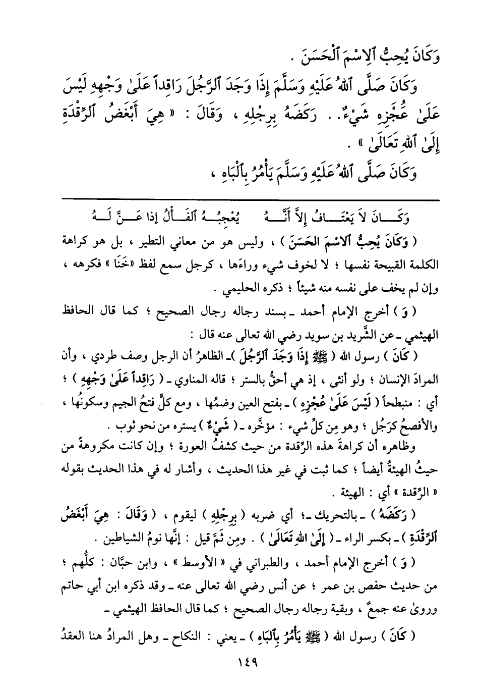 وكان صلّى الله عليه وسلّم إذا وجد الرّجل راقدا على وجهه ليس على عجزه شيء.. ركضه برجله، وقال: «هي أبغض الرّقدة إلى الله تعالى» .