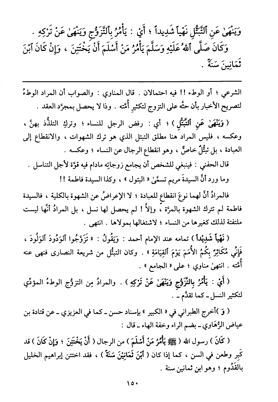(نهيا شديدا) تمامه عند الإمام أحمد: ويقول: «تزوّجوا الودود الولود، فإنّي مكاثر بكم الأمم يوم القيامة» . وكان التبتّل من شريعة النصارى فنهى عنه أمّته. انتهى مناوي؛ على «الجامع» .