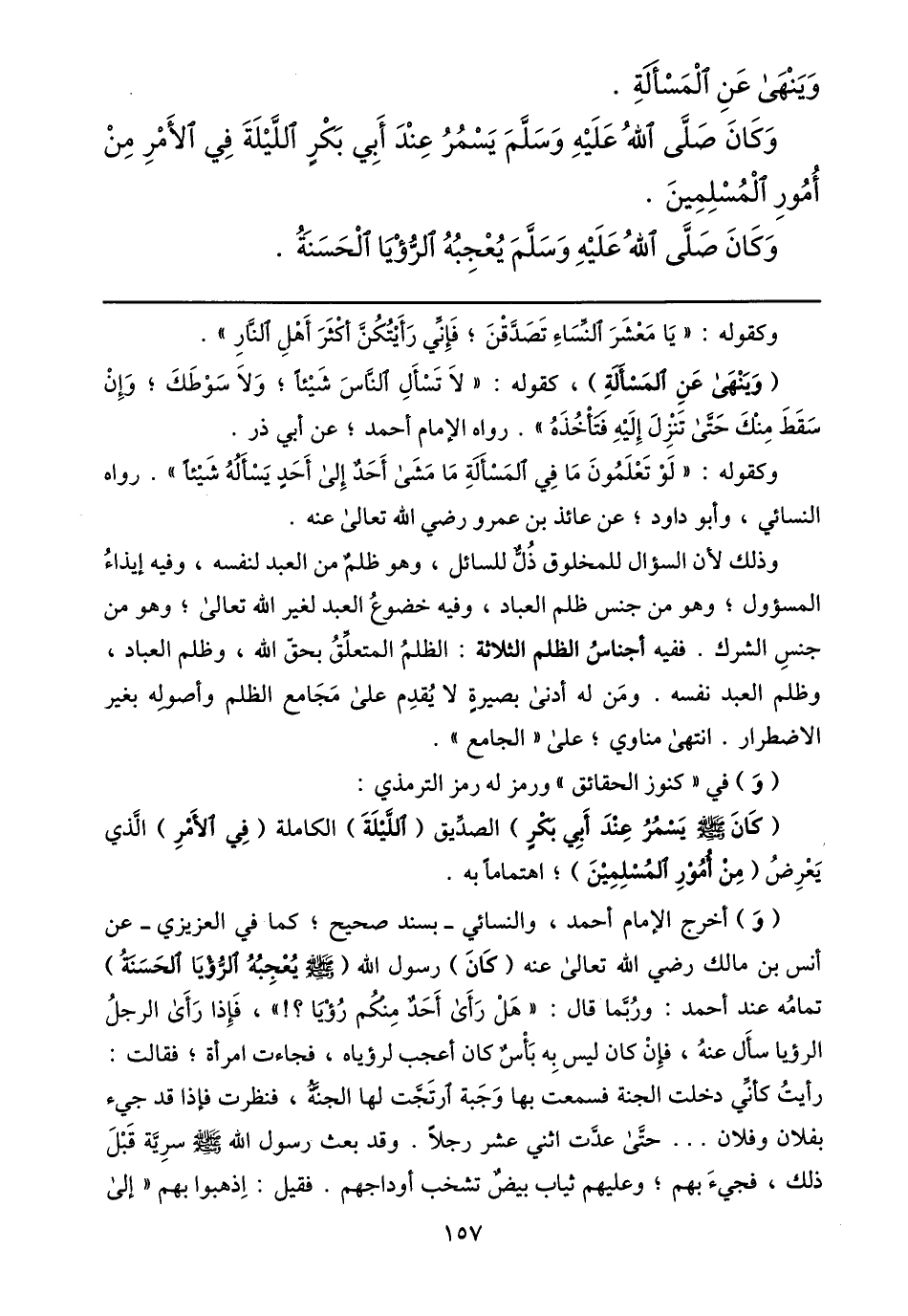 (وينهى عن المسألة) ، كقوله: «لا تسأل النّاس شيئا؛ ولا سوطك؛ وإن سقط منك حتّى تنزل إليه فتأخذه» . رواه الإمام أحمد؛ عن أبي ذر.
