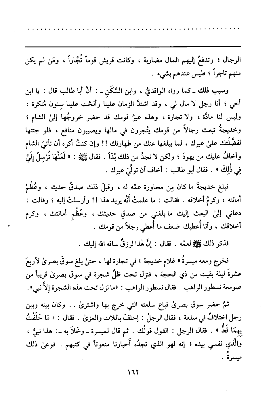 ثمّ حضر سوق بصرى فباع سلعته التي خرج بها واشترى.. وكان بينه وبين رجل اختلاف في سلعة، فقال الرجل: احلف باللات والعزى. فقال: «ما حلفت بهما قطّ» . فقال الرجل: القول قولك. ثم قال لميسرة- وخلا به-: هذا نبيّ، والّذي نفسي بيده؛ إنه لهو الذي تجده أحبارنا منعوتا في كتبهم. فوعى ذلك ميسرة.