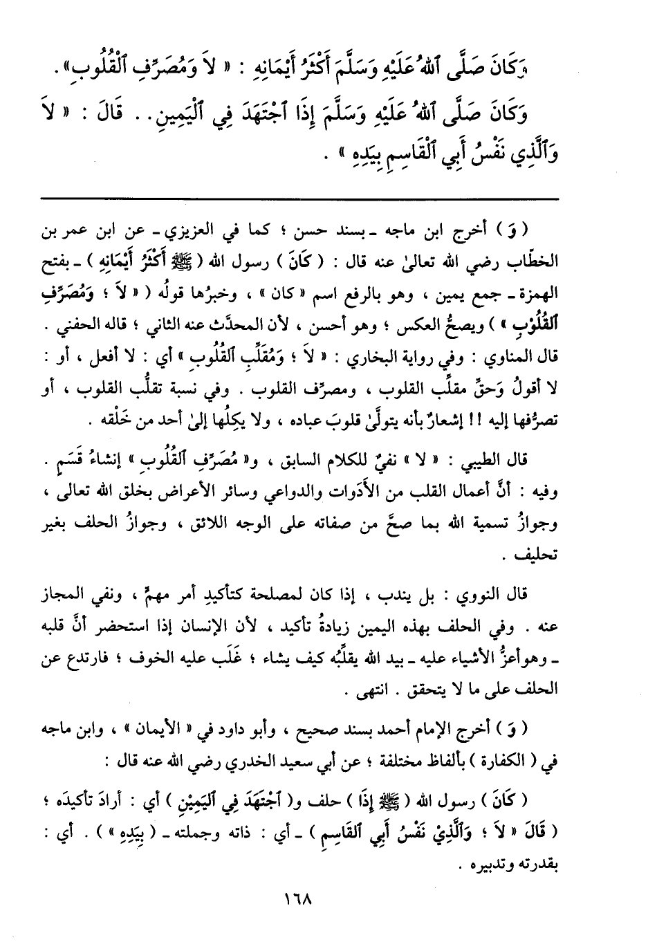 (و) أخرج ابن ماجه- بسند حسن؛ كما في العزيزي- عن ابن عمر بن الخطّاب رضي الله تعالى عنه قال: (كان) رسول الله (صلى الله عليه وسلّم أكثر أيمانه) - بفتح الهمزة- جمع يمين، وهو بالرفع اسم «كان» ، وخبرها قوله ( «لا؛ ومصرّف القلوب» ) ويصحّ العكس؛ وهو أحسن، لأن المحدّث عنه الثاني؛ قاله الحفني.