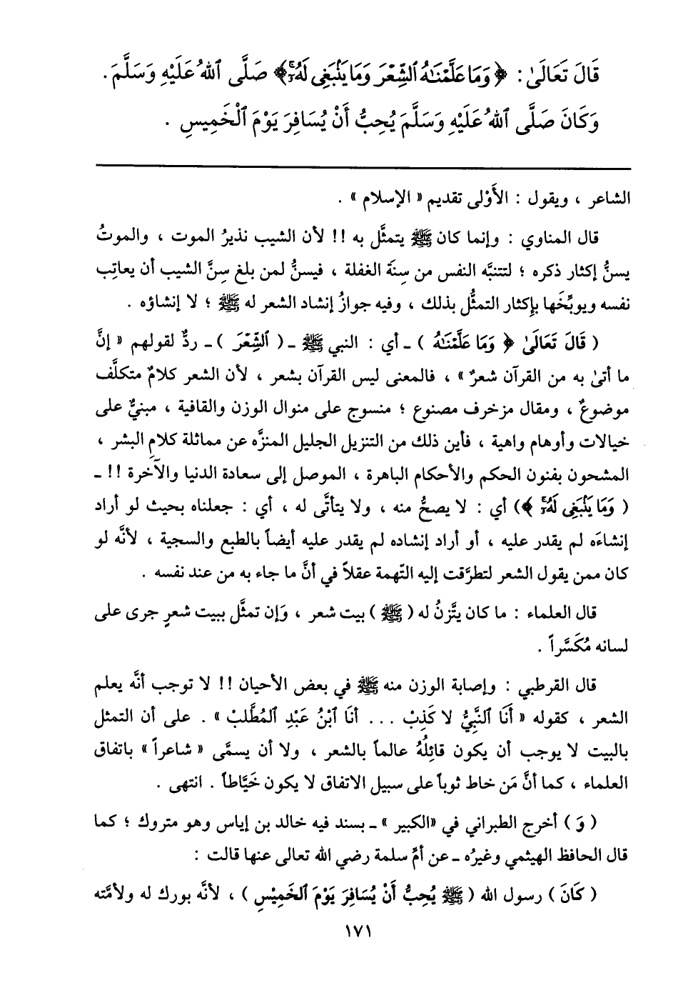 قال القرطبي: وإصابة الوزن منه صلى الله عليه وسلّم في بعض الأحيان!! لا توجب أنّه يعلم الشعر، كقوله «أنا النّبيّ لا كذب ... أنا ابن عبد المطّلب» . على أن التمثل بالبيت لا يوجب أن يكون قائله عالما بالشعر، ولا أن يسمّى «شاعرا» باتفاق العلماء، كما أنّ من خاط ثوبا على سبيل الاتفاق لا يكون خيّاطا. انتهى.