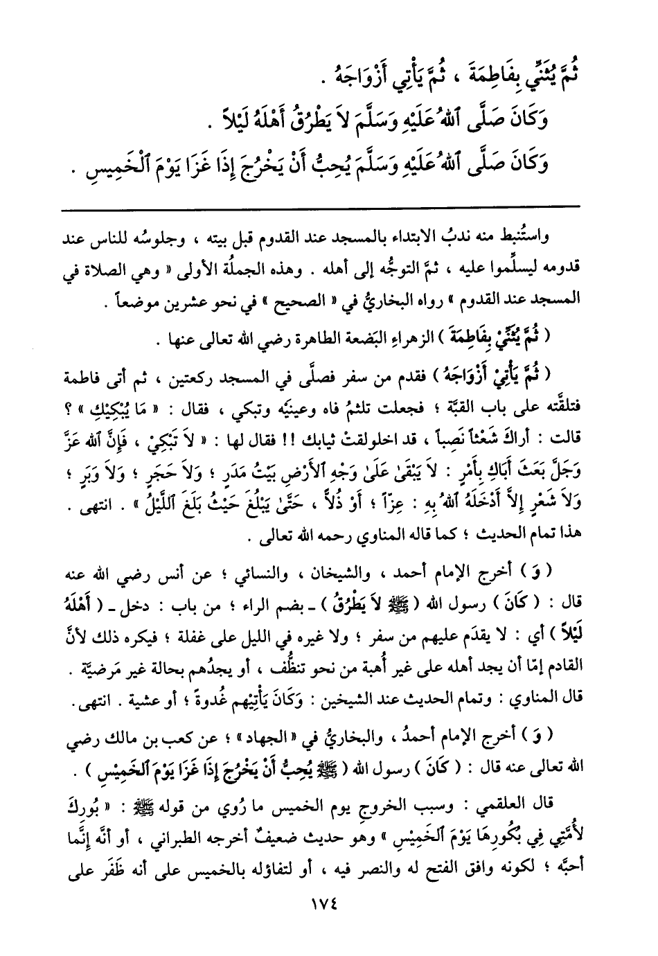 (ثمّ يأتي أزواجه) فقدم من سفر فصلّى في المسجد ركعتين، ثم أتى فاطمة فتلقّته على باب القبّة؛ فجعلت تلثم فاه وعينيه وتبكي، فقال: «ما يبكيك» ؟