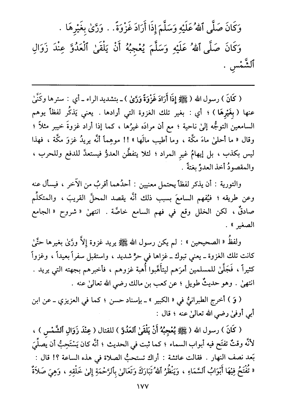 (كان) رسول الله (صلى الله عليه وسلّم إذا أراد غزوة ورّى) - بتشديد الراء- أي: سترها وكنّى عنها (بغيرها) ؛ أي: بغير تلك الغزوة التي أرادها. يعني يذكر لفظا يوهم السامعين التوجّه إلى ناحية؛ مع أن مراده غيرها، كما إذا أراد غزوة خيبر مثلا؛ وقال «ما أحلى ماء مكّة، وما أطيب مالها» !! موهما أنّه يريد غزو مكّة، فهذا ليس بكذب، بل إيهام غير المراد؛ لئلا يتفطّن العدوّ فيستعدّ للدفع وللحرب، والمقصود أخذ العدوّ بغتة.