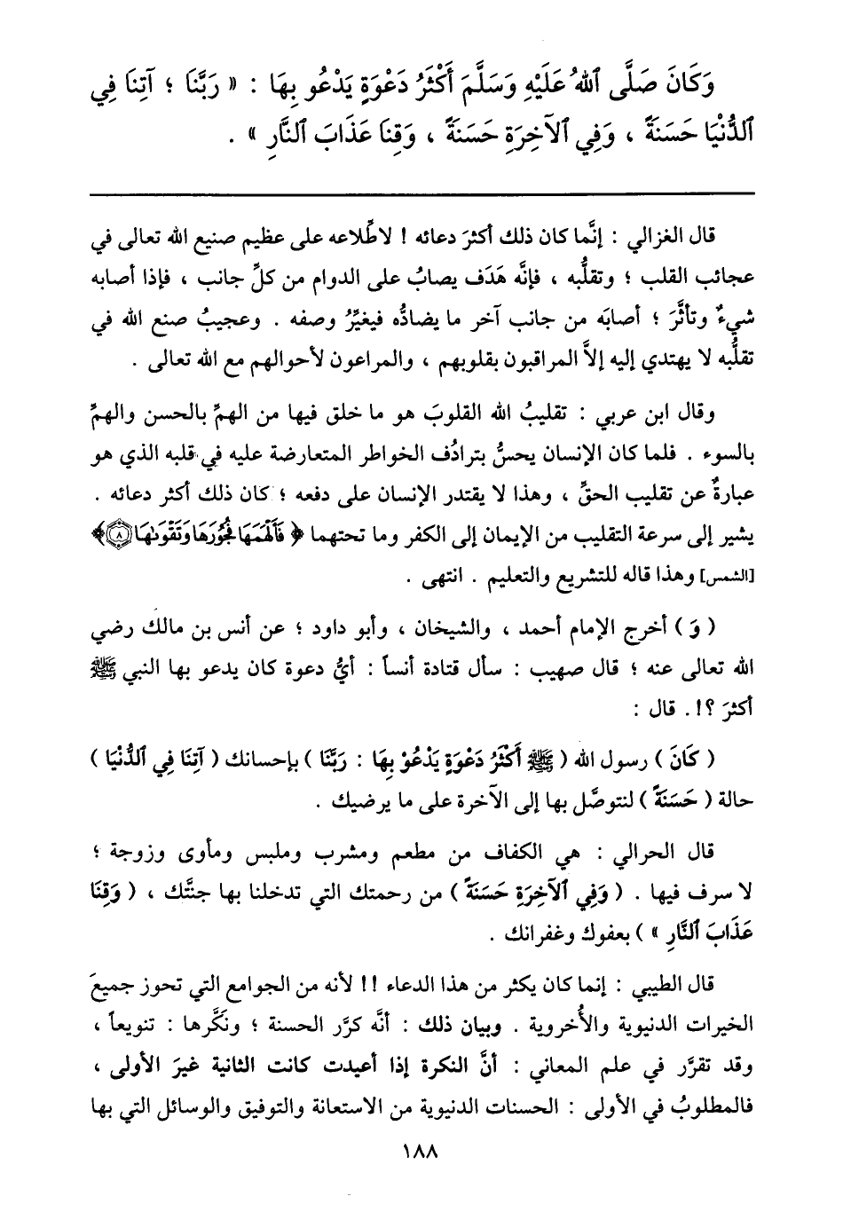 (كان) رسول الله (صلى الله عليه وسلّم أكثر دعوة يدعو بها: ربّنا) بإحسانك (آتنا في الدّنيا) حالة (حسنة) لنتوصّل بها إلى الآخرة على ما يرضيك.