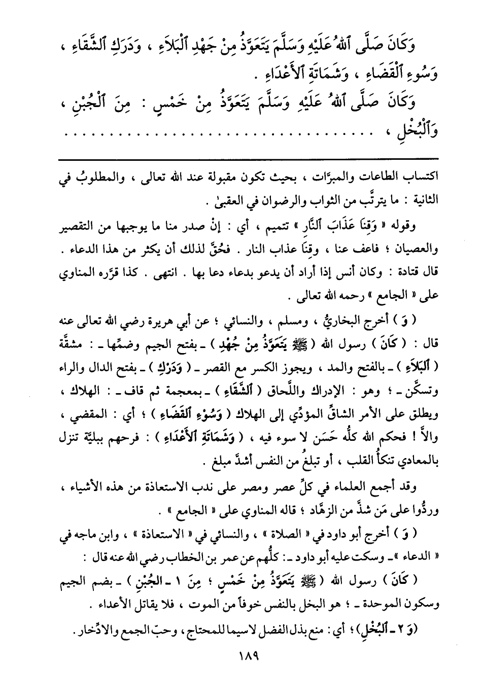 (و) أخرج البخاريّ، ومسلم، والنسائي؛ عن أبي هريرة رضي الله تعالى عنه قال: (كان) رسول الله (صلى الله عليه وسلّم يتعوّذ من جهد) - بفتح الجيم وضمّها-: مشقّة (البلاء) - بالفتح والمد، ويجوز الكسر مع القصر- (ودرك) - بفتح الدال والراء وتسكّن-؛ وهو: الإدراك واللّحاق (الشّقاء) - بمعجمة ثم قاف-: الهلاك، ويطلق على الأمر الشاقّ المؤدّي إلى الهلاك (وسوء القضاء) ؛ أي: المقضي، والّا! فحكم الله كلّه حسن لا سوء فيه، (وشماتة الأعداء) : فرحهم ببليّة تنزل بالمعادي تنكأ القلب، أو تبلغ من النفس أشدّ مبلغ.