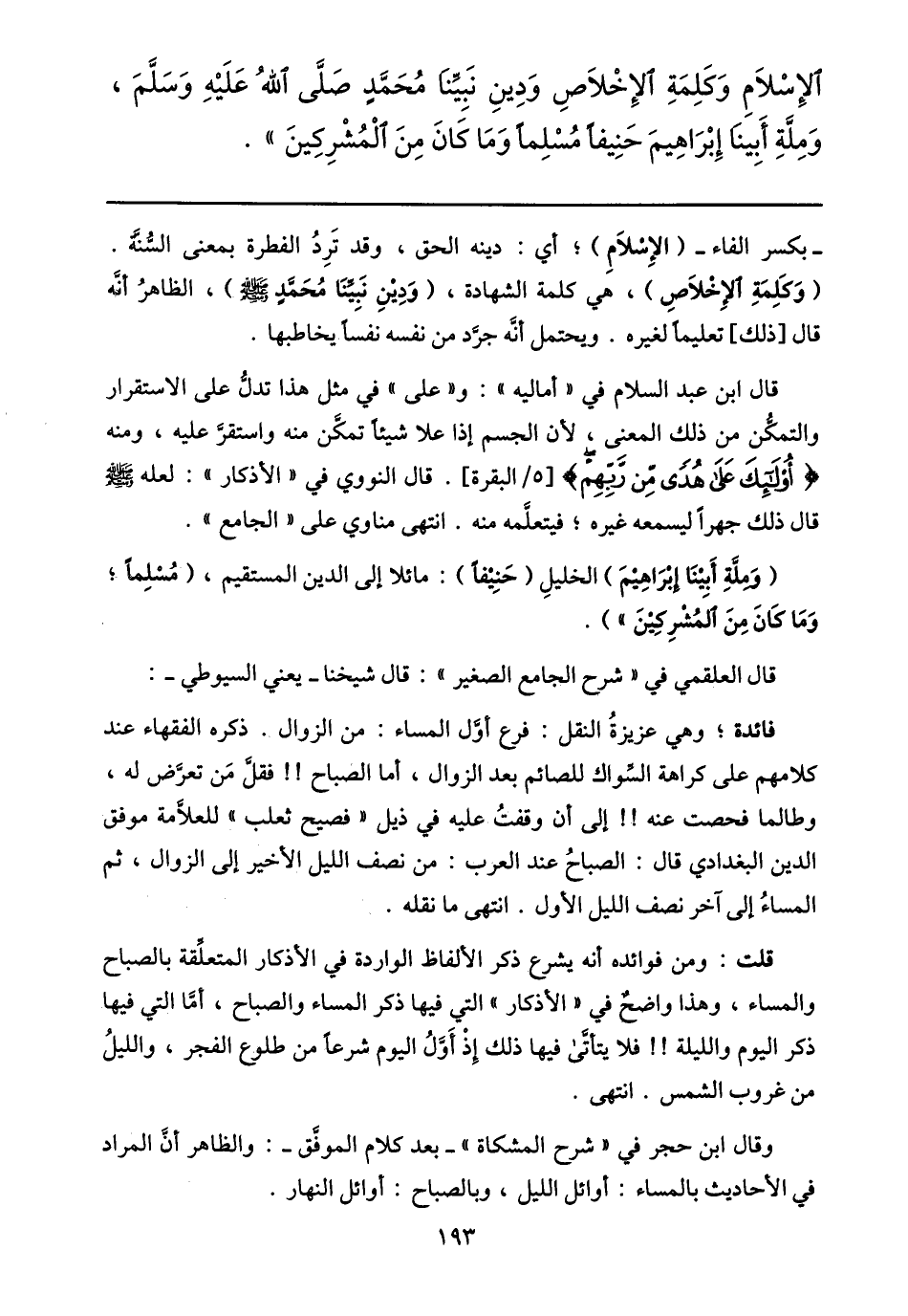 الإسلام وكلمة الإخلاص ودين نبيّنا محمّد صلّى الله عليه وسلّم، وملّة أبينا إبراهيم حنيفا مسلما وما كان من المشركين» .