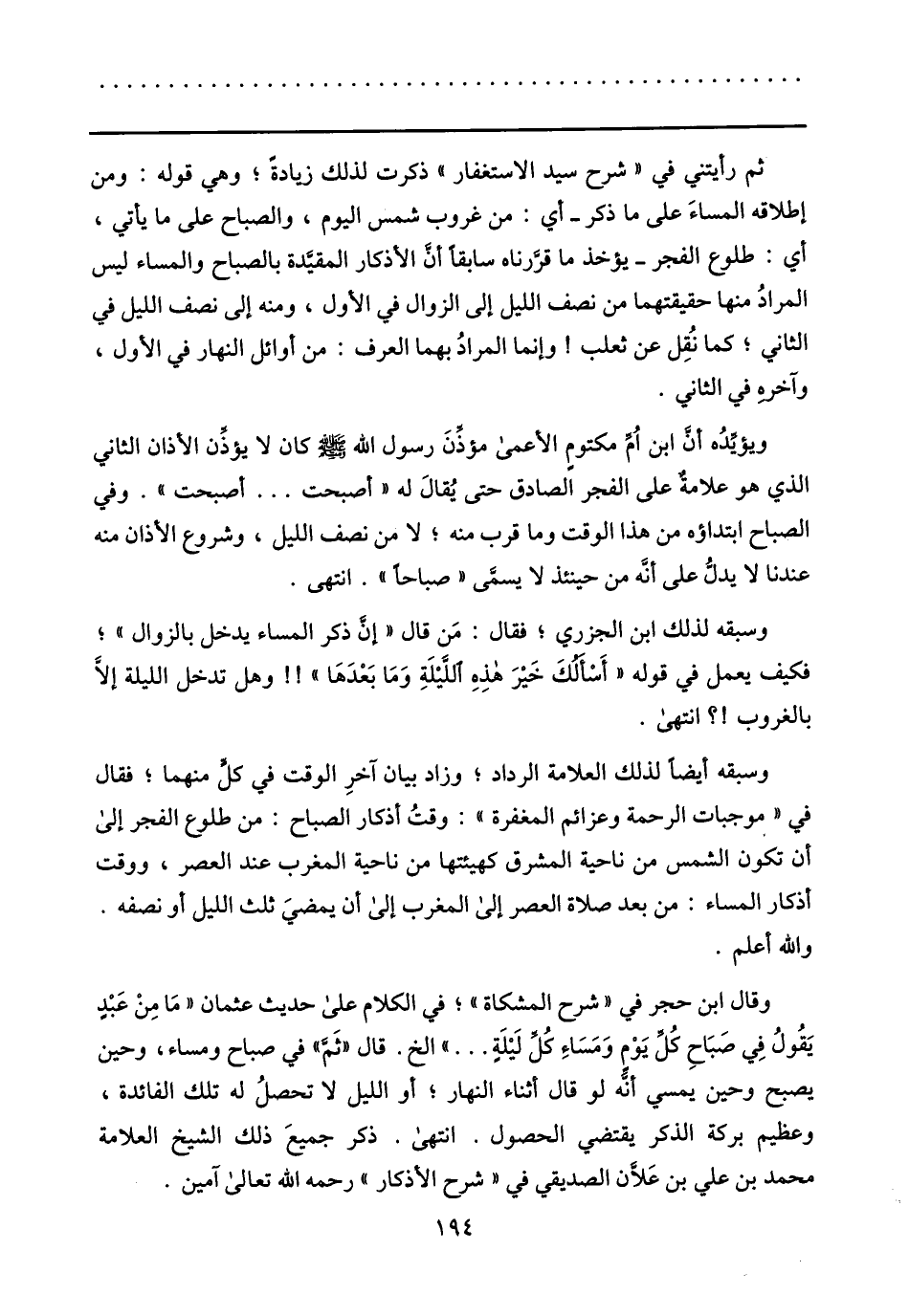 وقال ابن حجر في «شرح المشكاة» ؛ في الكلام على حديث عثمان «ما من عبد يقول في صباح كلّ يوم ومساء كلّ ليلة ... » الخ. قال «ثمّ» في صباح ومساء، وحين يصبح وحين يمسي أنّه لو قال أثناء النهار؛ أو الليل لا تحصل له تلك الفائدة، وعظيم بركة الذكر يقتضي الحصول. انتهى. ذكر جميع ذلك الشيخ العلامة محمد بن علي بن علّان الصديقي في «شرح الأذكار» رحمه الله تعالى آمين.
